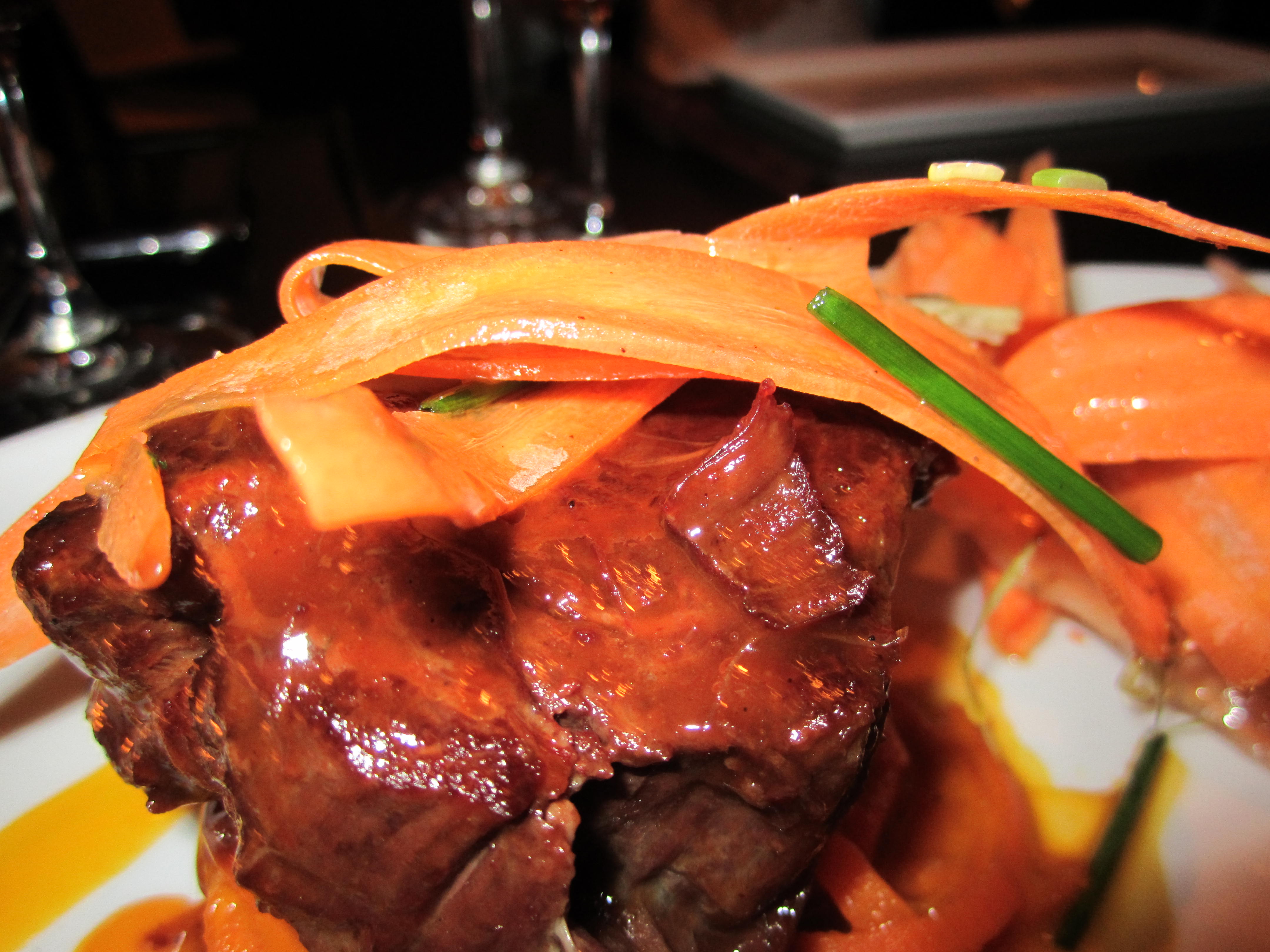 Juneau loves to take a single, often humble vegetable and use it in several ways on a dish. He also likes involving a raw ingredient to provide freshness and texture, especially when the main protein is rich and unctuous. The dish with which he won the Championship – crisp-skinned St. Canut piglet belly glorified with various iterations of beetroot and Granny Smith apple – was one case in point. Another was last night’s beef cheek, the first of three main courses we also shared. The big chunk of meat proved marvellously tender and unctuous, set over carrot cut and cooked like fettucine and sauced by the beef’s seeping juices. Buttery mashed carrot shared the plate and the whole thing was smothered with ribbons of raw carrot. Bugs Bunny would have had a field day but for me, it was one carrot too many.
