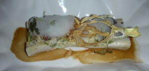 Other starters are more elegantly presented. Here’s a fabulous, rich, home-made-tasting duck and onion broth poured from a jug into a bowl containing duck confit meat, soft onion and croutons topped with an Ontario gruyère foam. Or here’s a marrowbone split lengthways to act as a vessel for a mixture of tender tasty dungeness crab meat with fennel and tiny medallions of the bone marrow. Brodi finishes it under the broiler with a sprinkling of gratinéed cheese then tops it with fennel foam and a tissue-thin stencil of a fennel root crisp. Crab and fennel is always a delectable combination – this dish takes them to lobster thermidor country.