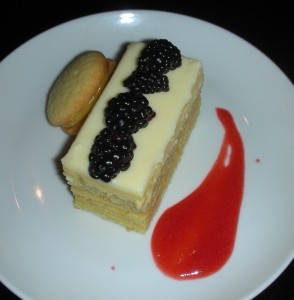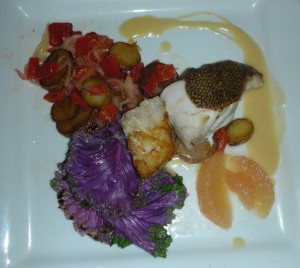 Carolina stone bass was a gorgeous piece of fish, moist and tasty. Pascoe paired it with pan-fried fingerlings tossed with red pepper and soft white onion and some pretty purple kale leaves. His sauce of grapefruit beurre blanc wasn’t the best idea, however, the mild bitterness of the grapefuit ganging up with the mild bitterness of the kale to nudge the dish off kilter.