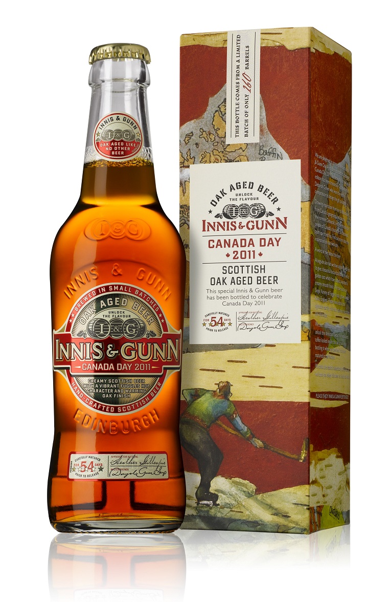 A beautiful coincidence… I have just been writing about Innis & Gunn Original, the Scottish oak-aged beer, for the upcoming Holiday issue of the LCBO magazine Food & Drink, when what should appear on my doorstep but the new, brief star from the brewery produced in honour of Canada Day. Innis & Gunn is an accidental work of art. The story goes that a whisky distillery decided to temper some bourbon casks they were intending to use for their whisky by filling them with ale. The ale remained in the casks for 37 days and was then poured out. The experiment worked and the distillers (Wm. Grant & Sons) ordered more. Meanwhile the brewers tasted the no-longer-wanted ale and found that it was amazing! Oak-aged! Complex and profound and full of oaky-whisky aromatics. (Full disclosure: it was the Caledonian Brewery in Edinburgh; the brothers who made the discovery and went on to develop the notion of oak-aged beer are Neil Innis Sharp and Douglas Gunn Sharp – hence the name Innis & Gunn, also known as Innocent Gun in the UK…)