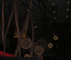 The space is on the corner so two sides of the room are floor-to-ceiling windows. “They’re 36 feet high,” explained the dapper Saldini, “so we get a great deal of light in here. And just hanging the fine-mesh steel curtain that covers the southern wall of windows was an incredible undertaking.” A third wall is a vertical, glassed-in wine cellar that houses the large inventory of wines, all of them excellent, all but a few beyond my wallet. The bar is backlit with pinkish red lights against which horizontal bottles of Gaja wine seem to swim like a school of black fish. Filling the air in this handsome lightbox is an extraordinary sculpture by Dennis Lin of ribbons of walnut wood (noce being Italian for walnut (geddit?)) swooping and writhing above and around glittering Moooi spheres of metal filigree studded with tiny lights like the balls of a giant plane tree bewitched by a fairy godmother. It all stops just on the honest side of Vegas kitsch – the antithesis of bland, and all the more welcome for that in our too-beige town.
