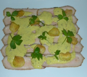 The dish that earned my first “wow” rating of 2011 was Aria’s version of vitello tonato, one of my favourite things to eat in the world. The veal was impeccable – pan-seared tenderloin sliced very thinly; the sauce a purée of tuna, capers, anchovy (you can taste all three) bound with egg yolk. It’s the quality of the eggs that give the sauce its unexpectedly yellow colour. Tiny potato chips the size of dimes add subtle crunch while a garnish of miniature fronds and microgreens bring fleeting bittersweet chlorophyl flavours. Deftly done.