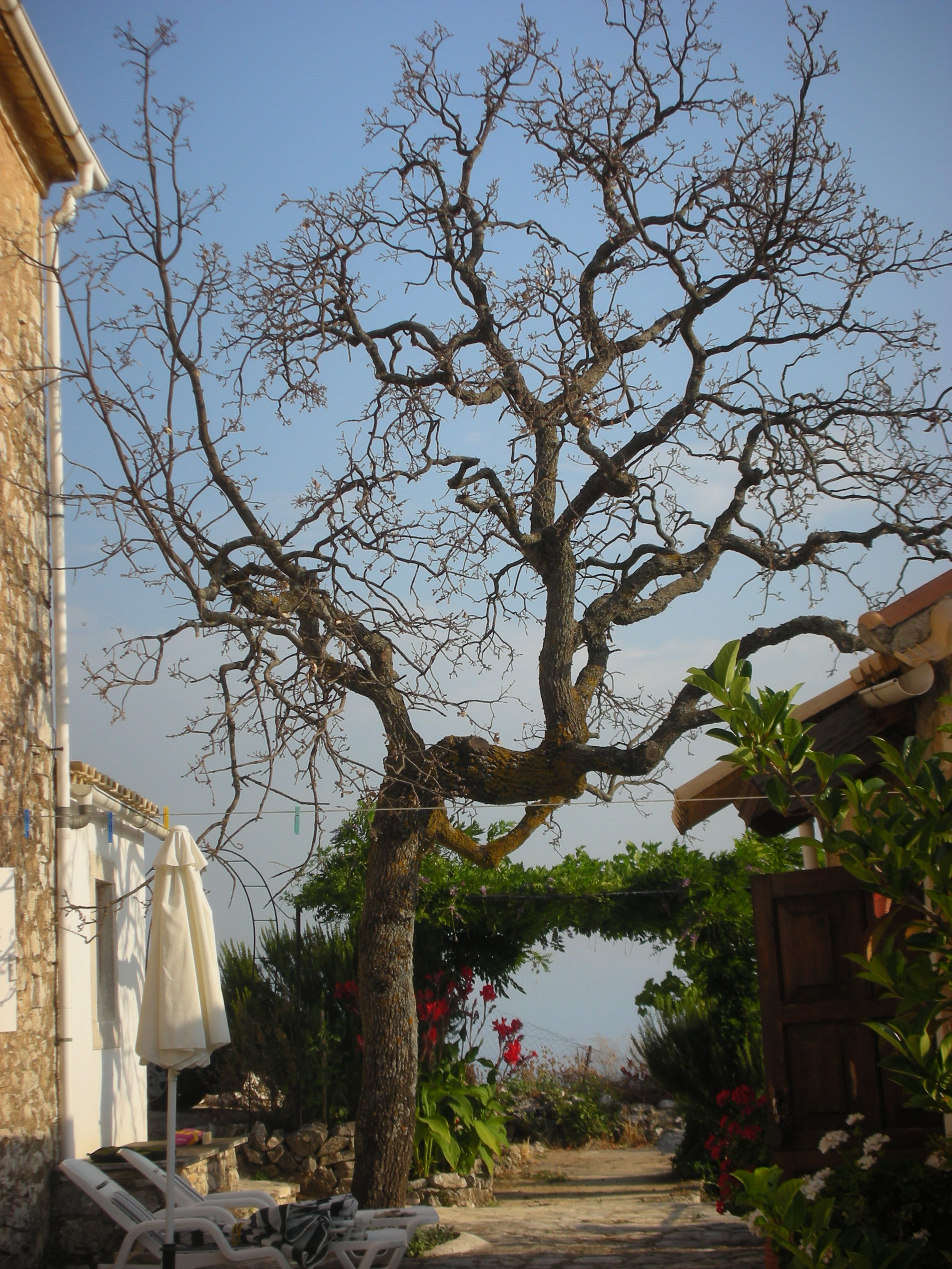 Such a sad arrival at our house on Corfu. Our beloved oak tree in the courtyard was stone dead – black and leafless and gaunt against the blue sky and the vine-covered klimateria. It was a tree of great significance to us for almost 30 years, providing shade and beauty. Its great lateral bough was perfect for a swing when our children were tiny. Owls used it as an observation post when hunting at dusk. A friend with a chainsaw came and took it down over the weekend. Now there is nothing but sky overhead when we step out of our front door.
