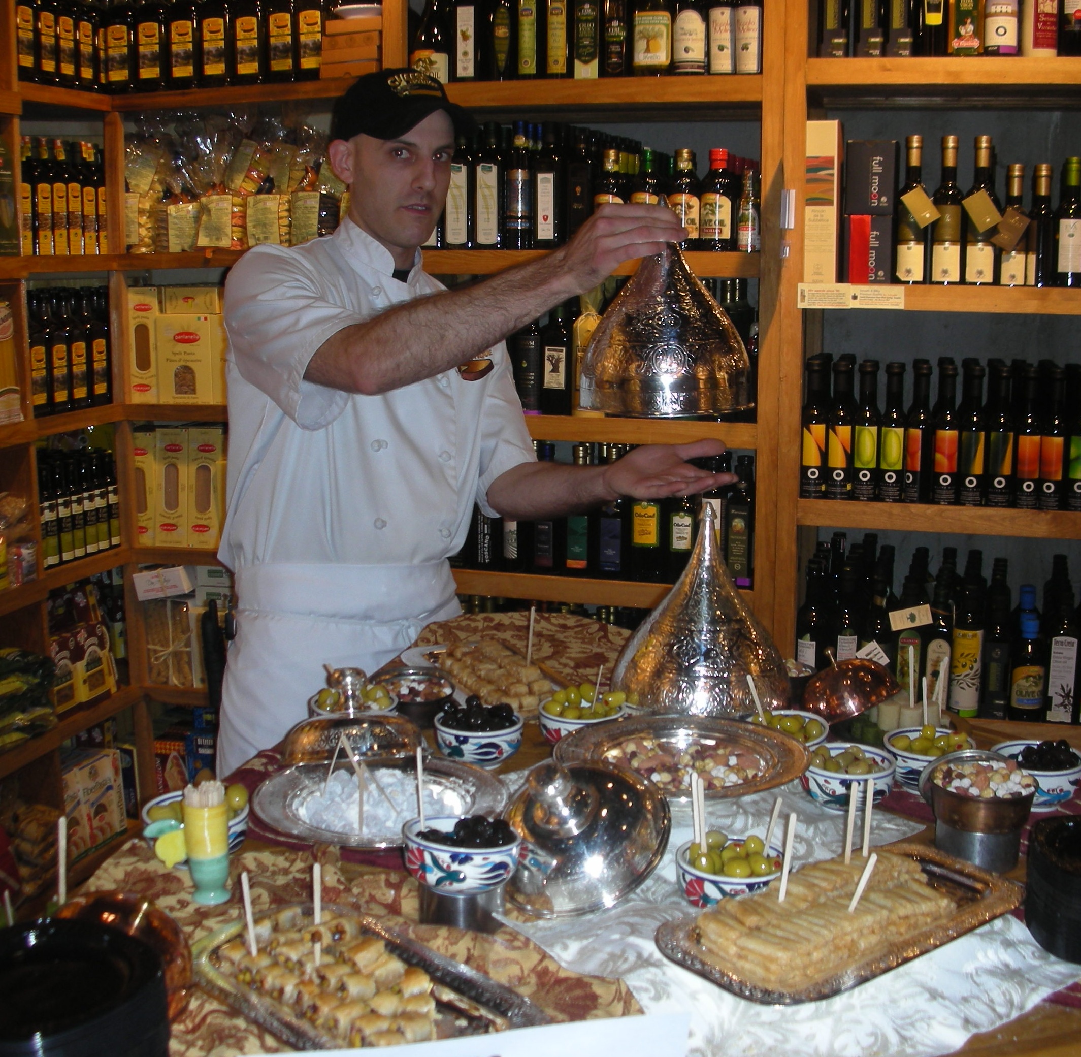 It’s over! I had thought we all had til Monday to get to Cheese Boutique (45 Ripley Avenue, just about where the Queensway meets the South Kingsway – but you know this) in order to taste some pretty spectacular stuff. The Pristine family had flown in three chefs from one of Istanbul’s top hotels, the Çiragan Palace Kempinski, courtesy of Turkish Airlines, to show us how profundly amazing very high-end Turkish food can be. They had a gala evening at the Boutique last Thursday with hundreds of guests enjoying the treats provided by the chefs – almost all ingredients flown in from Istanbul. The quality was astonishing. I was particularly mesmerized by the olives. They had obviously been picked early for they were an almost yellowy green, like the palest peridots. They seemed to glow as they lay in their ornate bowls, each one stuffed with a slivered almond as white as snow. Beside them, hidden under beaten silver cloches, were tiny pastries, amazingly fresh, made from phyllo and various nuts, slightly sweetened with honey. There were dishes of Turkish delight dusted with confectioner’s sugar, little cylinders of emerald green pistachio paste or cream-coloured almond paste like the marzipan apotheosis. Such dainties… They put everyone on their best behaviour.