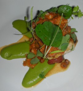 A thick, very juicy fillet of red grouper is rolled up and smothered by an étouffée of sweet shrimp chopped up and stirred with Sea Island red peas in a creamy tomato sauce. Stealing the show are thick slices of Blondin’s own hickory-smoked andouille sausage, like firm, peppery, fine-grained chorizo, that works marvelously well with the fish. Vegetables are turned into a thick “chlorophyl purée” of parsley, chives, chervil, spinach and a little parsnip for texture. Raw green Euclid Street oxalis leaves are strewn over the top. A side dish of collard greens is so good I want to eat it every day for ever – the forthright, slightly bitter flavour sweetened by a milky herbsaint dressing and unexpected slices of soft pancetta hidden among the leaves.