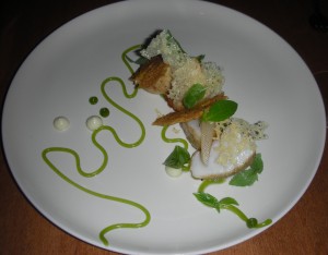 Dinner starts with a long dish of pickles in lieu of bread –big white celery pieces, cauliflower, green beans, okra (best of all) pea shoots, sea asparagus, breakfast radish… each one individualized with its own degrees of saltiness, sweetness and acidity.