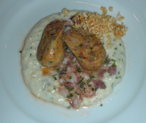 Glancing over the list of dishes in the competition, it seems that foie gras is currently Calgary’s favourite ingredient, featured in six of the ten we tasted. It was not, however, a component of the dish that took the bronze medal, created by chef Justin Leboe of Model Milk Restaurant. He began with delectably creamy hominy grits (ground in-house he explained) flecked with chervil, tarragon and chives. In the middle, he set a spoonful of chopped rock shrimp and the chopped lean meat from a ham hock, sharpened with a gentle vinaigrette. On top of that came two large pieces of a spectacular sausage made from side-stripe shrimp and more ham hock, full of flavour but with a soft, moist texture. Adding scrunch to the dish were fried tapioca shrimp crackers, like crisp little bubbles. It was a dish that hit directly at one’s pleasure centre, as did the well-matched wine – a charming 2010 rosé from Bartier Scholefield in the Okanagan.