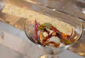 Our gold medal dish was the work of Michael Dekker from Rouge restaurant. He called it a Foie Gras Sundae and that’s exactly what it was, served merrily in a Martini glass with a jaunty poppyseed tuille. A ball of foie gras ice cream perched on top of a layer of candied oats, drizzled with reduced balsamic and strewn with microgreens. Beneath the ice cream was a slice of foie gras torchon, as rich and firm as cold butter. At the bottom of the glass lurked rhubarb compote, its sweet-sharp tang and fruitiness the key to the success of the wine match and indeed of the dish, as one dug down, mixing the different components for each rich and sinful mouthful. Chef Dekker’s wine was the 2008 Cabernet Icewine from Stratus in Niagara – sweet enough, obviously, but also, mercifully, possessed of the necessary acidity to boost the rhubarb and cut through all that sleek, smooth, inscrutable fat.