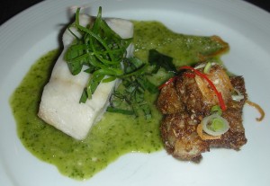 Our silver medallist was Jan Hrabec of Crazyweed Kitchen in Canmore who won gold here in 2009. Her dish last night was stellar, exploring south-east Asian flavours and beautifully paired with the fresh, tangily citric Fumé Blanc from Peninsula Ridge Estates in Niagara. Hrabec set a pure, tremblingly tender piece of steamed sablefish over a vibrant peanut nahm jim sauce – a perfectly pitched balance of the sweet, sour and salty made with ginger, garlic, lime, coriander, palm sugar, peanuts and fermented fish sauce. Beside it were cubes of pork belly that had been braised, deep fried, tossed in tamarind and then rolled in lemongrass and chili, lending them a fabulously subtle chili heat that built in one’s mouth. A garnish of chopped herbs and threads of chili finished the dish. The wine was asked to do double duty – cutting the richness of the pork and cradling the delicate fish: success on both counts.