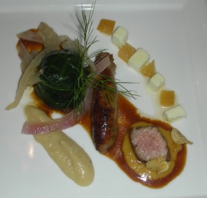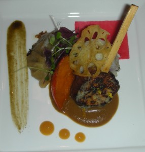 Our silver medal, for the second year in a row, went to Caroline Ishii of Zen Kitchen, a vegetarian restaurant and one of Ottawa’s finest. Chef Ishii described it as dedicated to the memory of her mother’s home cooking when she was growing up in Japan – and also to the flavours of the fall. It was a dish of many components: a pan-fried gyoza dumpling stuffed with chopped shiitake and oyster mushrooms and a little kimchee beside a smear of subtly spiced “Japanese curry” sauce; a “lollipop” of rich, soft, grilled eggplant, salty and sweet beneath its yuzu-Asian pear dengaku sauce; a sturdy grilled onigiri rice cake folded around a stripe of shiso-umebochi pesto; a chunk of roasted kabocha squash with an apple-butter miso glaze; a most beautiful crimson square of tissue-thin pickled watermelon radish; a final garnish of a crispy wheel of lotus root dusted with matcha-wakame salt; and three dots of very spicy persimmon-mango-habanero hot sauce for those who wanted to turn up the heat. As I said, a complex dish with masses of autumnal flavours going on, but Ishii’s refined aesthetic made a harmony out of all the flavours. Her wine was a personal favourite of mine, Cave Spring Cellars’s 2009 Chenin Blanc, its lovely intensity reaching in and through the exotic ingredients.