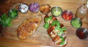 The main event of our dinner, however, was the fried chicken – a dish intended for two. Served on a wooden board, two substantial chicken breasts have been cooked sous vide and then differently treated – like twin sisters who have grown up in different parts of the world. One has a tamari glaze of great complexity – spicy-sweet and altogether delicious. The other has had a brush with a spice rub featuring allspice and chili and has then been battered and fried. It’s pretty well perfect fried chicken, juicy and flavourful, and ends up being the one we mess with, wrapping thick slices up in lettuce leaves with various combinations of the accompanying garnishes. You can see them in the opicture in their teeny metal bowls – cilantro, green onion, radish, pickled red onion, kim chi, grated fresh ginger, Thai chilies, avocado chutney with plenty of kaffir lime, bbq sauce, a squeeze bottle of red chili sauce. Awesome.