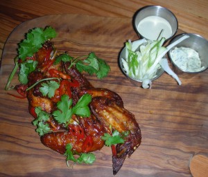 We started with a hearty soup full of chunks of tender, pale-as-pork ham, white beans and hunky croutons of Marc Thuet bread. The thickish broth was tangy with mustard and lemon juice, thyme and rosemary – just the way to start a winter evening. I had the daily special of wings which were easily the best wings I’ve ever had (okay I’ve only ordered wings three times in my life, but these were the best). Legree cooks them sous-vide then flash-fries them so they’re unbreaded, relatively lightweight and glazed with a sticky and delectable bbbq sauce that avoids over-sweetness and gains depth from a hint of espresso coffee. The wings are strewn with sliced up raw red chilies and a mass of fresh cilantro. Three condiments are presented separately – a creamy, smooth blue cheese dressing, a herbed mayo, and a fresh, tangy apple slaw. Being almost a virgin where wings are concerned I don’t know the protocol of these extra sauces. They were too good to waste, but I was enjoying the wings’ own flavours so much I didn’t want to mask them. In the end, I used the bones as dippers and had the best of both worlds.