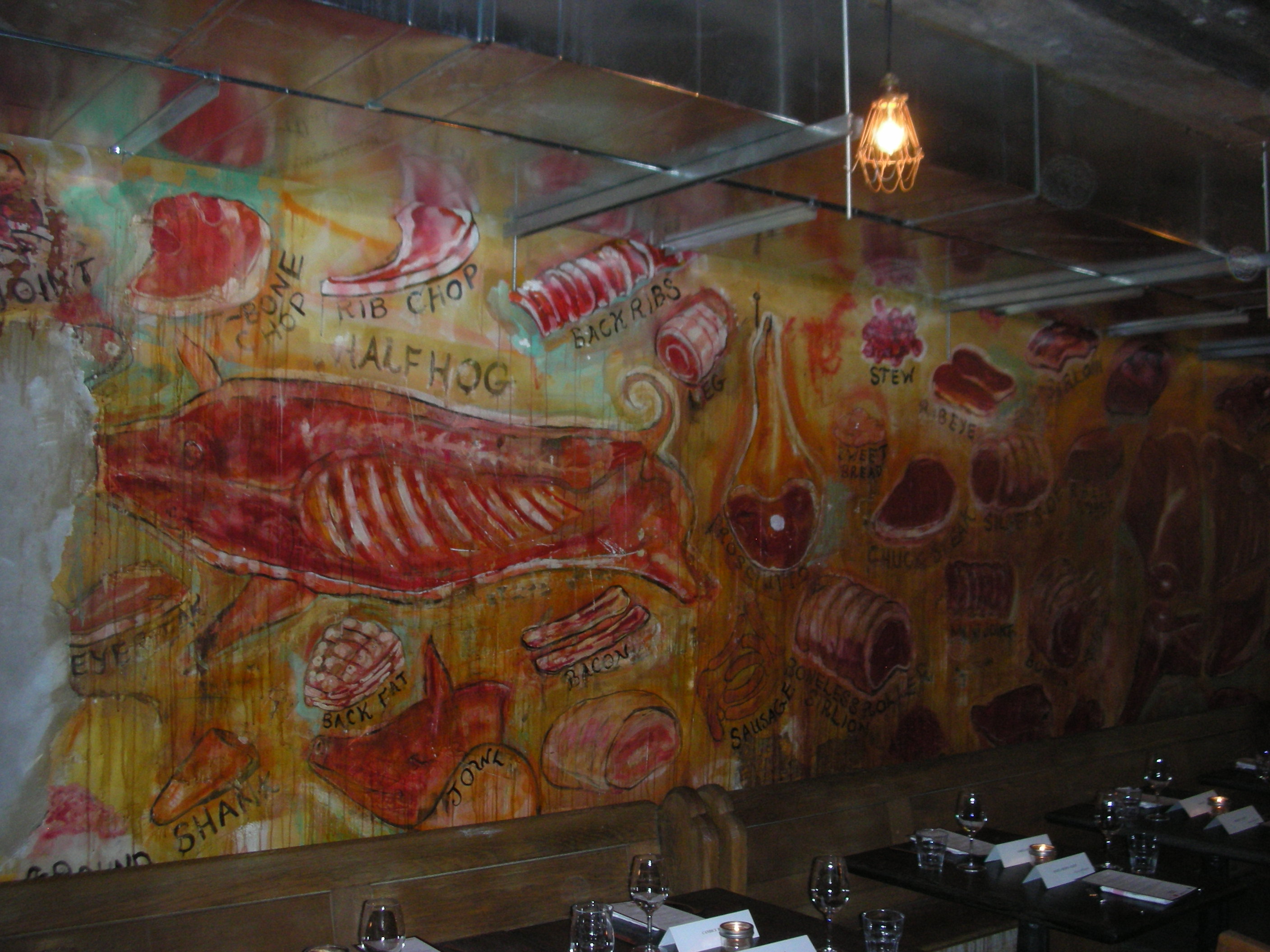 We had a fascinating preview of Rob Rossi’s new restaurant, Bestellen, last night when he and co-owner Ryan Sarfeld hosted a VISA Infinite dinner on the premises. It should open in early February but there have been some delays getting licenses from the City (Unheard-of! How astonishing!). Based on last night’s experience, I think Rossi is on to a sure thing for his first shot at chef-patron. The room is very long and narrow with a bar halfway down it and a big open kitchen at the rear. The décor is rustic but not rude with fine old barn boards on the ceiling and an arresting mural of animal parts on one of the walls. Meat will feature strongly on Bestellen’s menu (there’s a great big meat locker with a window for watching the beef dry ageing) and it was front and centre last night.