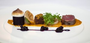 The bronze medal was awarded to Martin Kouprie of Pangaea who created another visually stunning plate. Here was a disc of bacon-wrapped venison striploin, incredibly tender and tasty, its red juices still held in the muscle. Beside that was a cube of venison liver cooked sous vide so it still had that almost crunchy texture that some rare offal provides; it was topped with a sweet potato and coriander crumble. The third major component was a blue potato polyhedron cooked sous vide in brown butter and topped with a perfect little toasted marshmallow spiced with a hint of nutmeg. Around these treasures, lightly pickled onion rings added a pleasing tang while a single white potato chip and a bed of silky sweet potato purée had us all thinking about Thanksgiving. Trailing down the side of the assembly a blueberry compote was perfectly judged in terms of sweetness. David Lawrason found the wine match the highlight of the tour – a smashing 2009 Pinot Noir, the 13th Street Essence.
