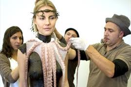 The idea of food couture returned recently when Lady Gaga actually wore a dress made of steak at the 2010 MTV Video Music Awards. Animal rights activists were furious but Time magazine declared it the year’s top fashion statement. Undoubtedly, the purpose of the stunt was to shock but the dress was rather beautifully cut (or should that be carved?) and looked, from a distance, like heavy silk. It reminded me of the striking images created by photographer Helge Kirchberger and chef Roland Trettl in which glamorous fashion models are dressed in various foods – an evening gown of cabbage leaves, a shawl of cawl fat, a chocolate bustière, a headdress made from a very large raw octopus, its tentacles draped elegantly around the model’s face, neck and shoulders while she stares with humourless inscrutability into the camera’s lens.