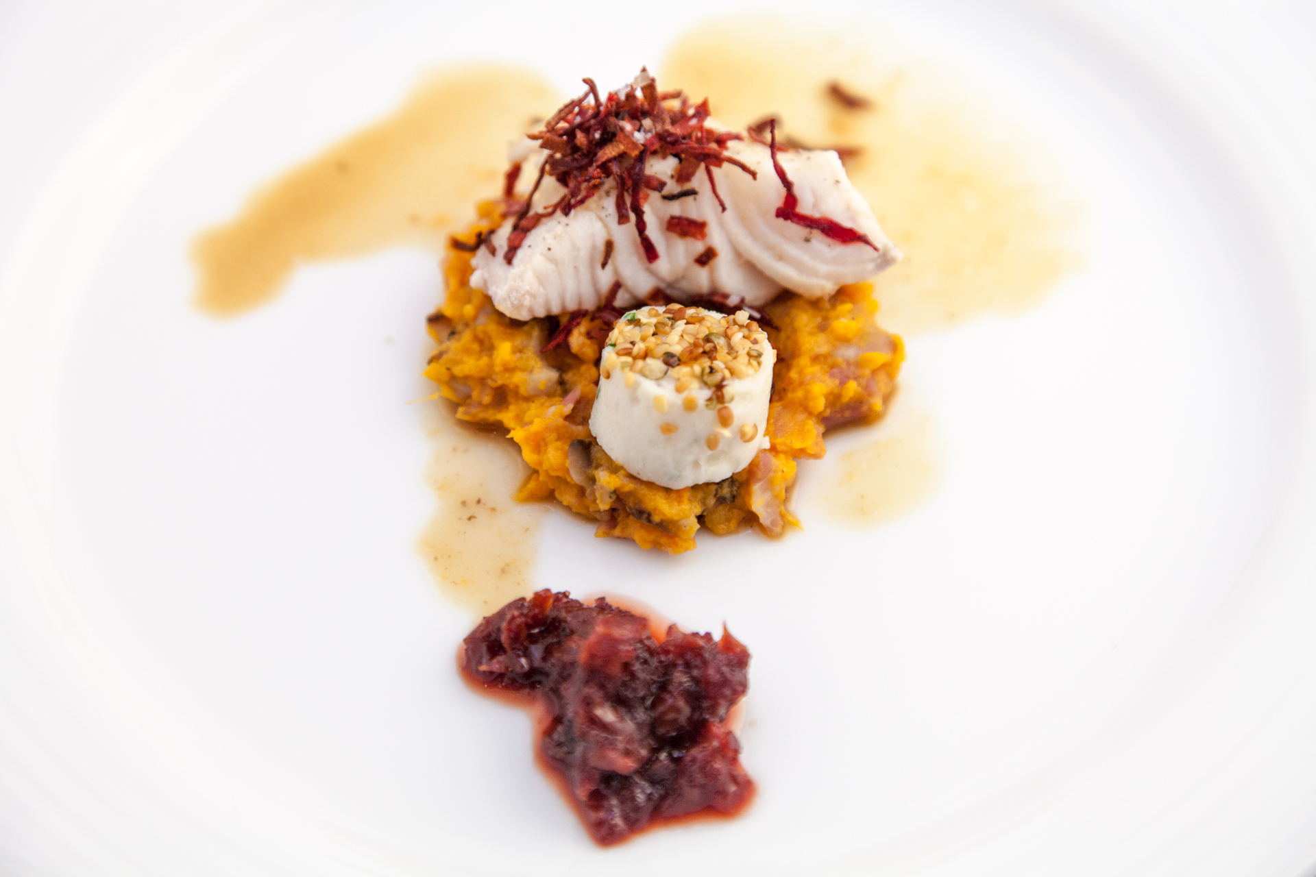 Darren Craddock came next. He worked with fish, poaching ling cod in a court bouillon of white wine, lemon, butter and herbs topped with deep-fried crispy beets and a sprinkling of smoked salt. A second protein was a faux scallop made from a mousseline of the ling cod trimmings, crusted with toasted hemp hearts. Pancetta and shiitake added oomph to a sweet potato mash and beet reappeared arm-in-arm with cherries and turned into a tangy jam. Generously seasoned, it was a good match with the wine.
