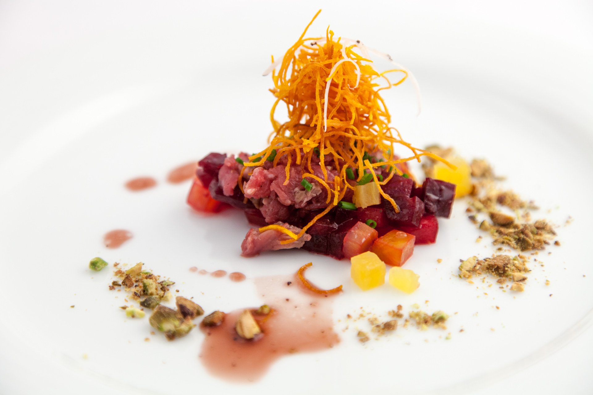 Jamie Stunt opted for a lamb tartare, using mildly-flavoured Abbotsford lamb. He ground some cuts, seared and hand-cut another, then stirred the meat with roasted beets. Toasted pistachios and black radish were other components, alongside deep fried threads of sweet potato for crunch. For richness, he smade a smoked turkey mayonnaise which perfected the balance between the dish and the wine – a most impressive effort.