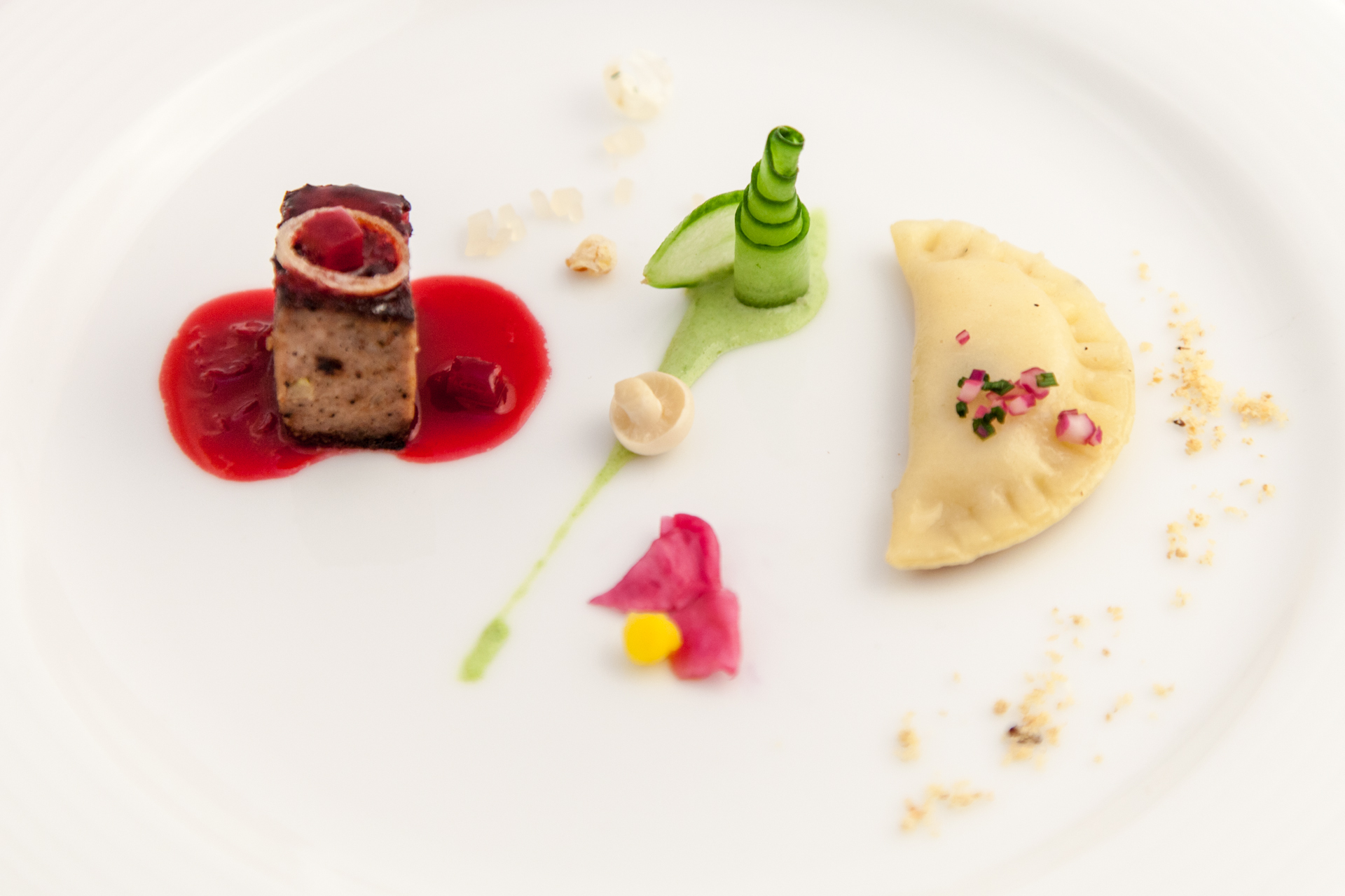 Nathin Bye was up next with a dish he called “Breakfast for Dinner,” each of its many components based upon sensations he found in his complex wine of choice, the 2010 Chardonnay from Tantalus Vineyards in the Okanagan. There was plenty on the plate, but the intricate knot of textural and flavour harmonies provided unexpected unity, all within a loose interpretation of breakfast. Where to begin…? With an ornamental spoon that held a creamy bircher meusli of rolled oats, apple and quinoa, garnished with a tiny marshmallow, a miniature grapefruit jelly, a sun-cured blackberry and a half-inch-high tuile shaped like the 2012 Olympic symbol. A quail egg fried sunny-side-up, its yolk still runny, sat on a plinth of potato, golden beet and cheese pavé which served as the substantial point of reference for many of the dish’s more ethereal elements. There was a mushroom pop tart made with dried, powdered mushrooms but the centrepiece of the whole affair was a maple syrup and bacon-infused panna cotta, coloured bright green with evaporated parsley dust. The panna cotta contained a surprise – a meaty heart of Texas-barbecue-style pulled pork paté that matched a delicate vertical ribbon of crispy triple-cured speck. There were two sauces on the plate – a swoop of cheese fondue and a thin, very pungent line of hickory-smoked barbecue sauce.