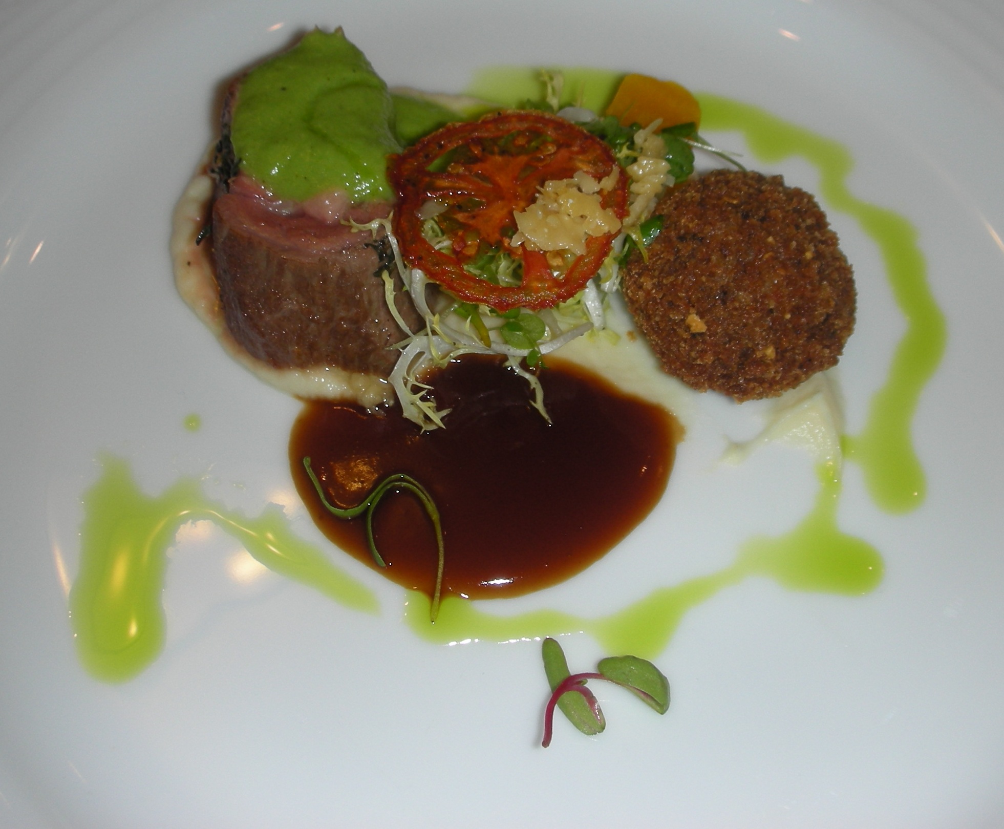 Darren Craddock also cooked lamb loin, preparing it sous vide with a hint of garlic and setting a little drum of it on the plate. He braised the shoulder and used the forked meat in a stiff croquette with truffles, chanterelles and mashed potatoes and parsnips, the ball crusted with hemp seed, pumpkin seed and sesame breadcrumbs. Moist and rich within, it was a show-stealer. Frisée dressed with cold-pressed camolina oil offered a bittersweet, leafy moment while a broad swathe of celeriac soubise sweetened with onion and cream was another moment of richness. A drizzle of green fennel oil decorated the plate while a column of compressed golden beet provided a cool, rooty sweetness of its own. A minted green pea foam worked predictably well with the lamb. A classic lamb jus reduction sauced the meat and the final garnish was a lateral slice of tomato, roasted to a crisp and so delicate it melted on the tongue, spiked with a crumble of pungent goat cheddar. Chef’s wine was the 2011 Kay-Syrah from B.C.’s Dirty Laundry winery.