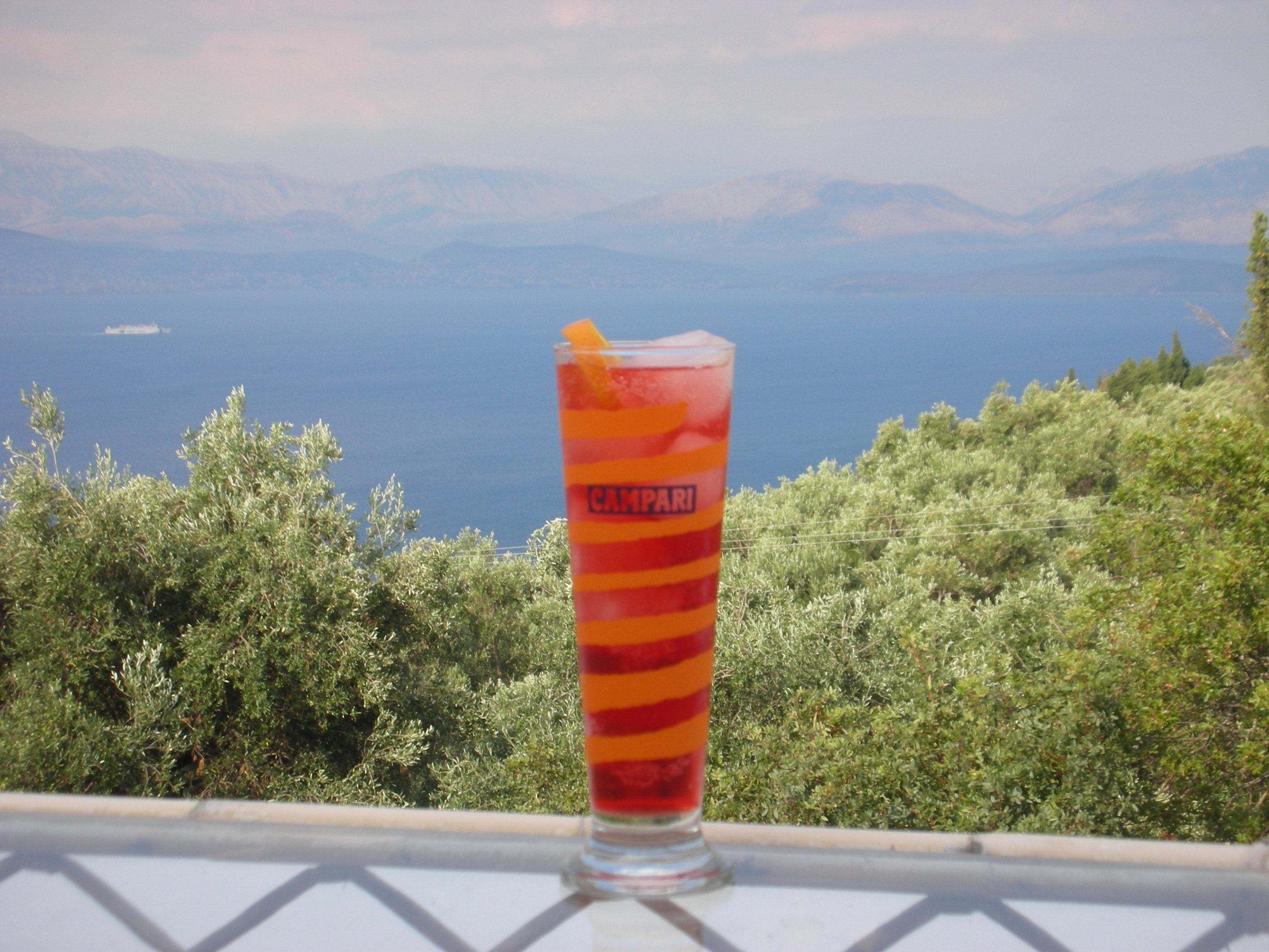 Sitting here on the high terrace of our old Greek house, enjoying the view of the Ionian and the hazy brown mountains of Albania, delighted by the excellent condition of the garden (cherished in my absence by Angeliki, our treasure), relishing the entirely selfish epidermal pleasure of a clean white shirt after a forceful shower after a salty plunge into the aforementioned Ionian, I sense one final detail might complete my happiness. There is no clock in the olive groves but the heat and the lengthening shadows confirm the whispered suggestion in my mind that it must be getting on for Campari Time.