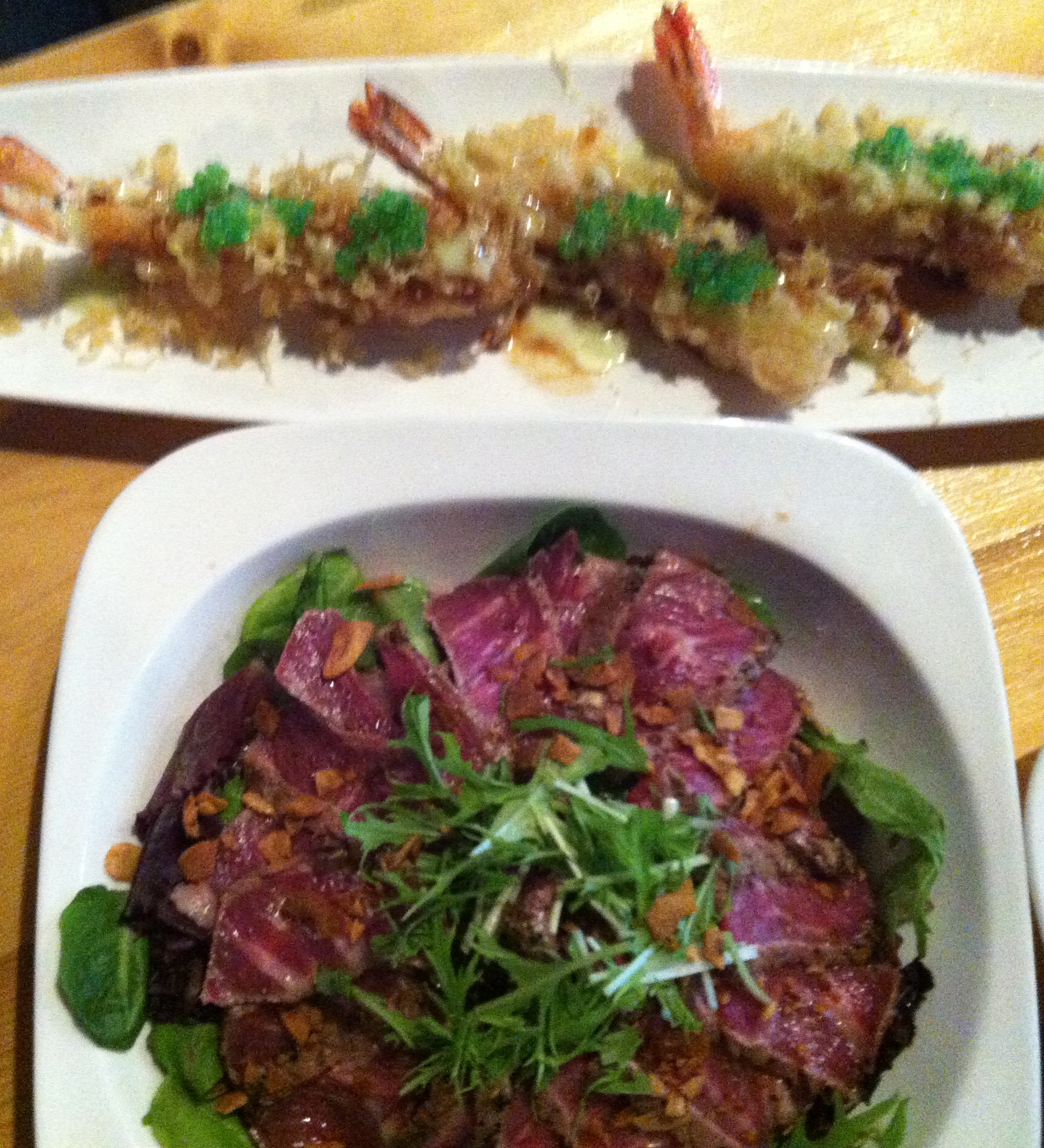Silky slices of beef tataki, very tender and barely seared, were draped over a tangy salad of red and green leaves garnished with arugula and fried garlic chips. The lobster roll was disappointing, a maki roll made with gummy rice and oily seafood. Wild jumbo shrimp tempura, on the other hand, drew cheers and the order had to be repeated – exceptionally well-timed, juicy shrimp in crisp tempura topped with green tobiko roe and green tea salt for dipping.
