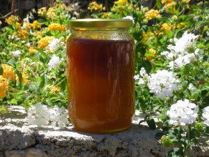 This is a jar of honey. Our neighbours, Yorgos and Kiki, keep bees and I’m proud to say they forage in our garden (the bees, not Y and K). So while I can’t claim to have produced this rich, dark meli with its complex floral, herbal, even malty character, I do see myself as its godfather, after a fashion. I don’t remember the name of the yellow and white flowers – I call them scrambled egg flowers, for obvious reasons – but they too have played their part.