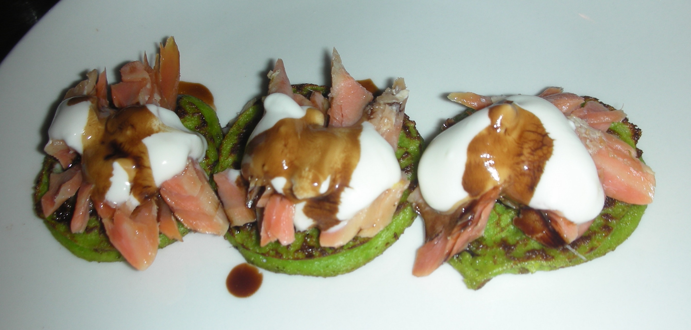 Smoked trout fragments on green pea blinis with crème fraîche dabbed on top were dainty half-bite-sized morsels, like passed hors d’oeuvres at a gallery opening. And there were four of us at the table but only three on the plate. I know three is the orthodoxy – chefs are taught always an odd, never an even number for this sort of thing – but when there are four customers who announce they will be sharing everything the server should twig and suggest he/she brings one each. We’d have been happy to pay an extra buck or two. Ditto for the wings which also came as a trio when we were a quartet. Whatever the surgical geometry required to divide three chicken wings into four equal portions was beyond me. So we just ordered more wings. (Which may be the cunning point, now I come to think of it).