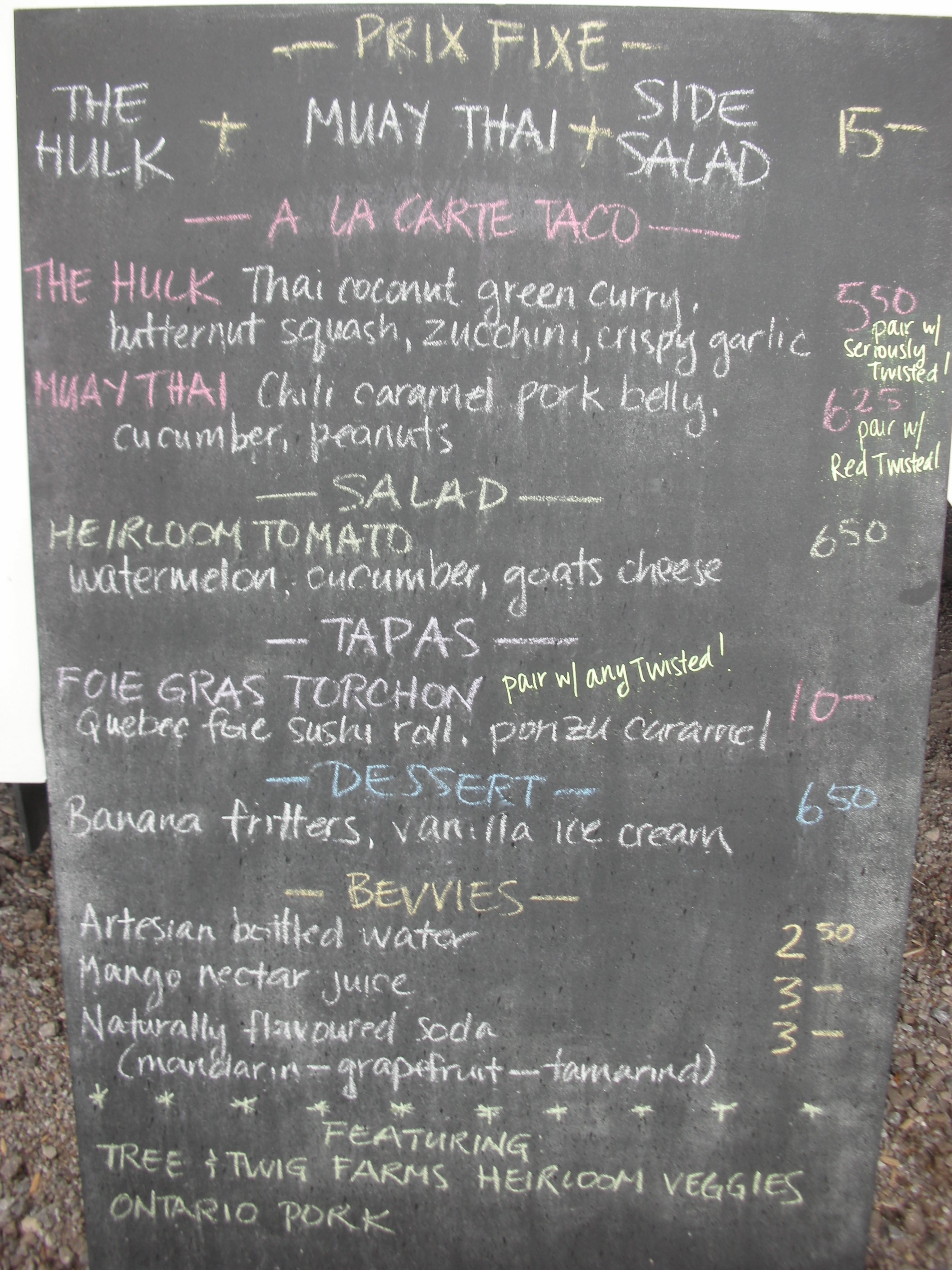 But I digress. Gastronomo Vagabundo is the creation of Australian chef Adam Hynam-Smith and his Canadian partner, Tamara Jensen. Hynam-Smith was most recently working at the esteemed E18hteen in Ottawa, but he and Jensen have sunk their savings into the white van and moved to the Niagara peninsula. I had a look inside the nifty vehicle and saw fridge and freezer, deep fryer and griddle, sink and a good-sized work surface, all pristine clean. The menu is eclectic to say the least, rich in local Niagara ingredients such as the awesome heritage tomatoes from Tree & Twig but with plenty of exotic European, Thai and South East Asian twists picked up on the chefs’ travels. Many of them use a crisp taco as an edible plate. A dish called “hulk,” for example, is coconut green curry chicken with cucumber, coriander, fried shallot and lime juice. “Kraken” is Greek-style pickled octopus, taramasalata and cucumber. “Ahab Rehab” involves crispy roast pork belly, rum-punched pineapple and bajan hot sauce.