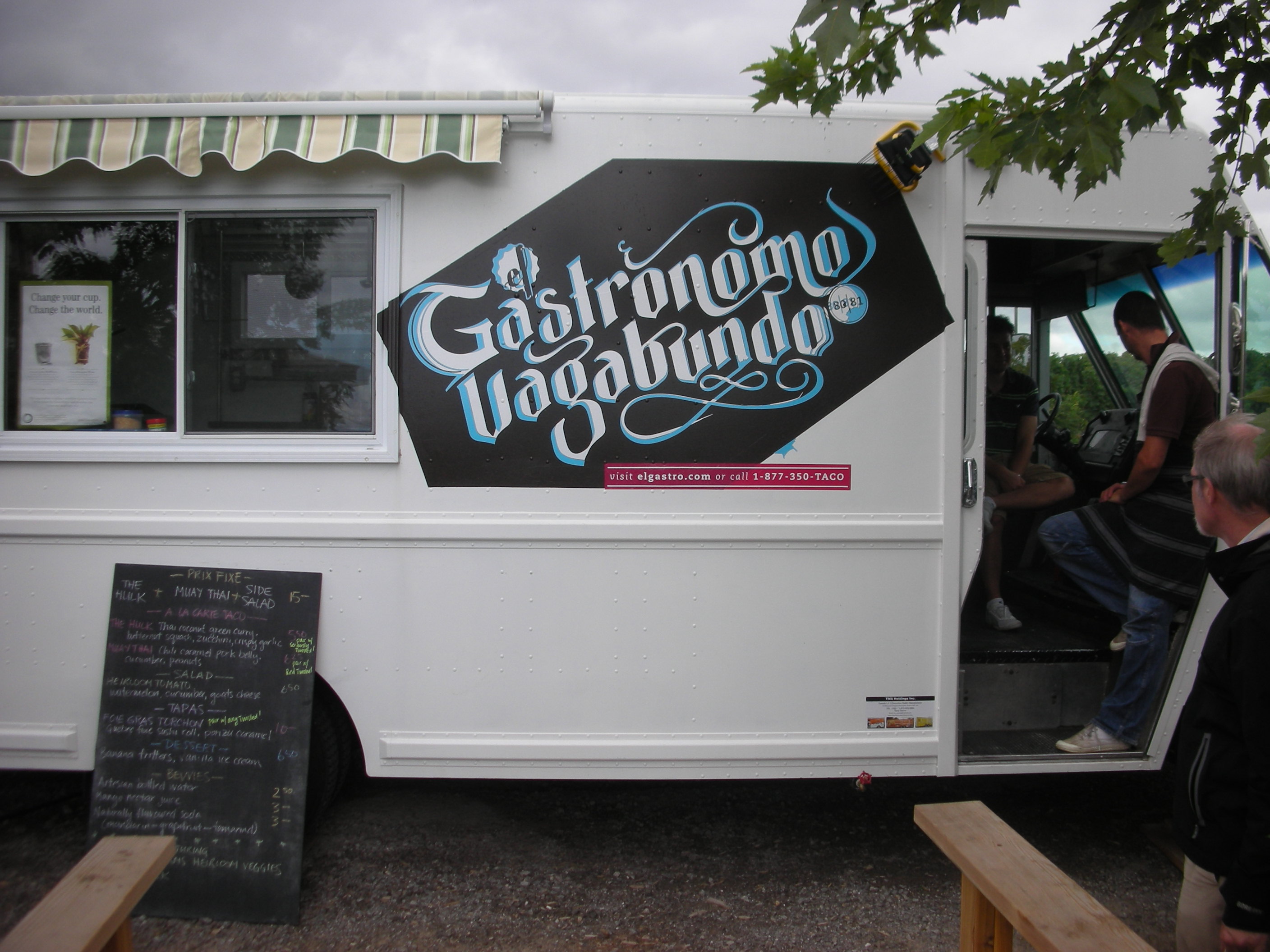 Life is strange, no? Here we are, half way through our spectacular culinary/oenological tour of Niagara, having just had a brilliantly executed, cunningly assembled, altogether delectable lunch at the Good Earth Wine and Food company (of which more later) framed by famous tastings of the finest wines of Tawse, Hidden Bench and Malivoire, when some of the group ask if we can stop briefly at Flat Rock Cellars to buy some bottles of the dazzling Chardonnay tasted last night (see my next posting). What should be parked in the driveway of Flat Rock but the white ice-cream-truck-style travelling wagon of Gastronomo Vagabundo.
