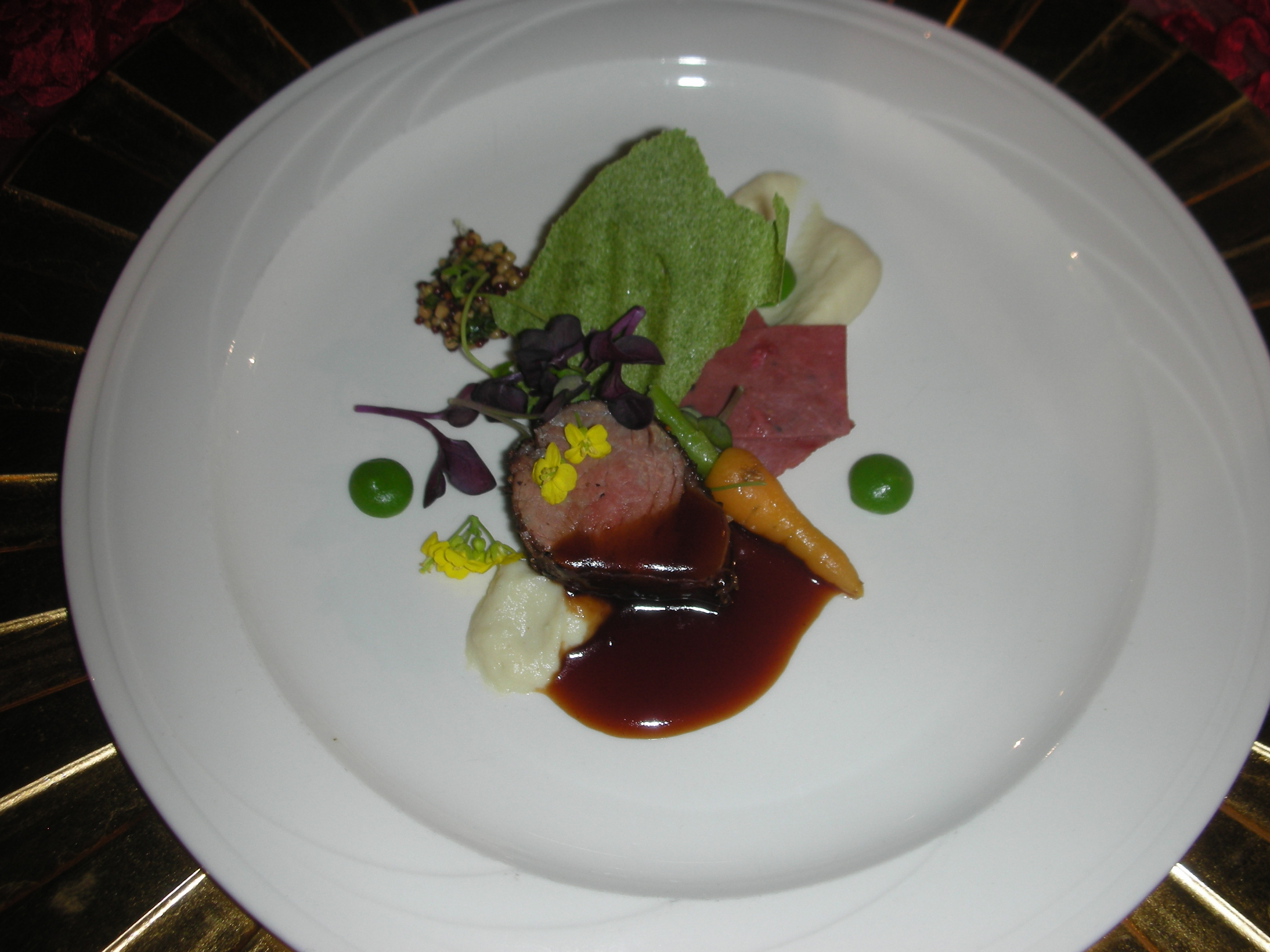 We awarded the bronze medal to chef Simon Reynolds of Simon’s Fine Foods who created an umame-bomb of a dish based upon superb Canadian lamb. He presented two little drums of the sirloin, cooked sous vide with thyme and a hint of truffle and topped each one with a finely minced tapenade of green olive and anchovy. Beside them he set a miniature spring roll with the lightest and crispest of wrappers, filled with moist, rich pulled meat from the shoulder. A smooth carrot and fennel purée lay beneath the sirloin and he added a sweet prune compote as a condiment. Perfectly textured haricot beans were a nice, earthy touch, paddling in a suave lamb jus and half a dozen crisp fried capers brought yet another flavour to the plate. All the elements worked beautifully together, producing innumerable permutations of flavour and texture. Chef’s wine was the marvellous 2011 Cabernet Franc from Lailey Vineyard in Niagara, a Cab that successfully bridged the divide between the fruit and the olives.