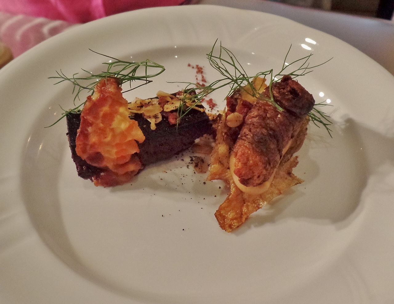 Chef Park turned to pork and blood to tame the wine, cooking a soft boudin noir flecked with slightly firmer mini-dice of pork belly: the whole pudding looked disarmingly like a chocolate brownie. Jerusalem artichokes were everywhere – as crispy chips and also as a luxe, caramelized purée invigorated by puréed Granny Smith apple and hidden inside a crispy shell. Roasted vanilla oat crumble was strewn like granola and a second crumble of salty bacon added to the overall intensity of flavour. A smudge of vanilla dust kept its distance on the edge of the plate, in case we decided the granola needed reinforcements.