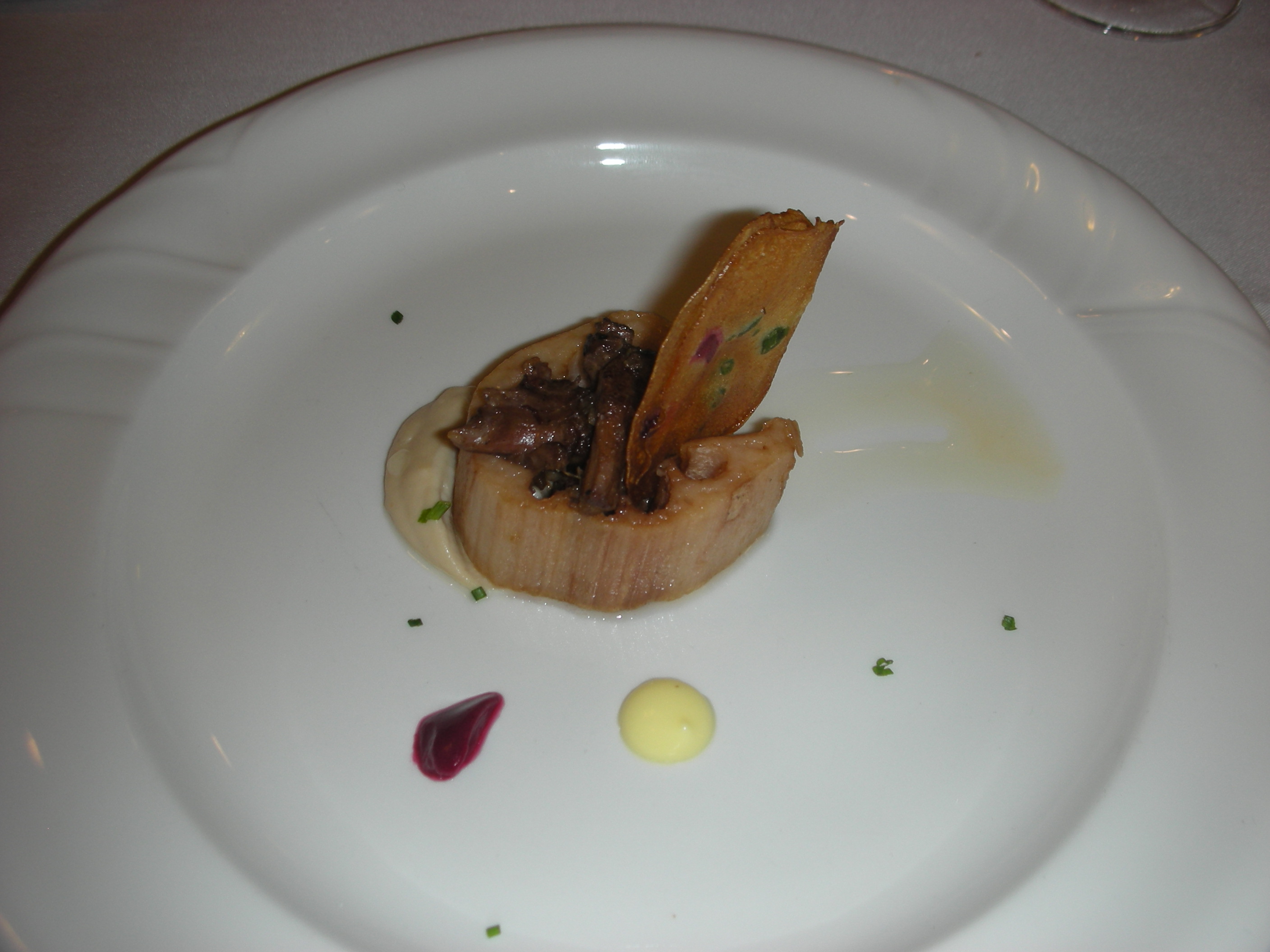 Chef Rebello offered a fascinating presentation, typical of his affection for culinary and visual puns. He cut lotus root into the shape of a marrow bone and confited it in duck fat, then he braised oxtail and spooned it inside instead of outside the “bone.” As so many of the chefs did, he felt the wine demanded fat on the plate, and rovided it by turning the fat from the oxtail into a dab of aïoli. A delectable puré of lotus, cauliflower and cashew nuzzled up to the lotus; a blueberry and blackberry gastrique that was almost jelly-like in its consistency echoed the fruit flavours Chef found in the wine. The finishing touch was a wafer-thin fin of translucent potato slices sandwiching flecks of cherry and beet sprout. He called this dish “Illusion.”