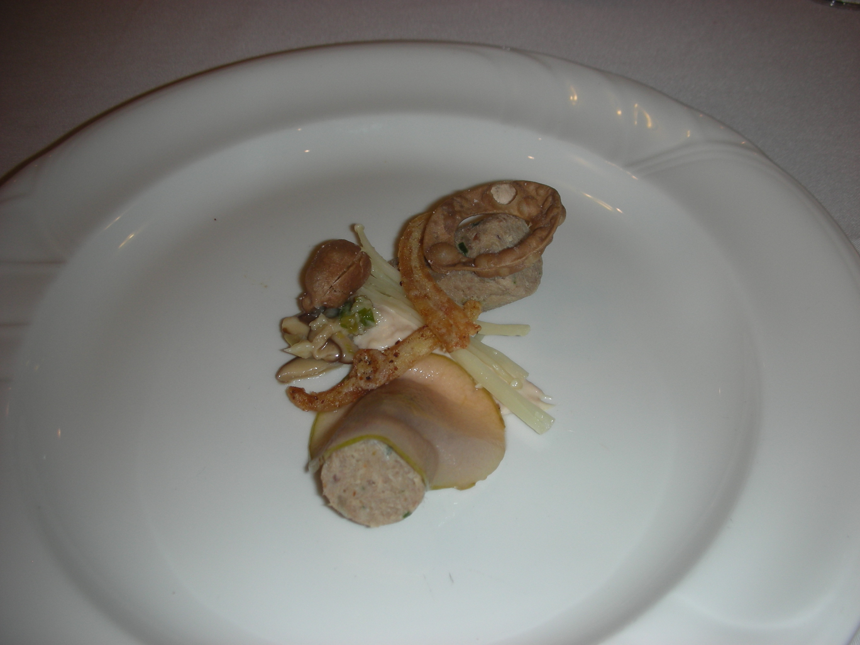 Chef Bohati decided chilled, nose-to-tail pork would provide the necessary fattiness to match the Pinotage. He made an oniony pork-belly rillette shaped like a sausage and flavoured with five-spice then set it over an aïoli of smoked ham hock sweetened with vanilla bean. A crispy blood wonton furthered the porcine cause, as did crispy deep-fried pig ear dusted with five spice powder. Earthiness came courtesy of marinated enoki and shiitake mushrooms; freshness was provided by a tissue-thin slice of compressed pear, prepared with some of the wine, lemon, cinnamon and sugar.