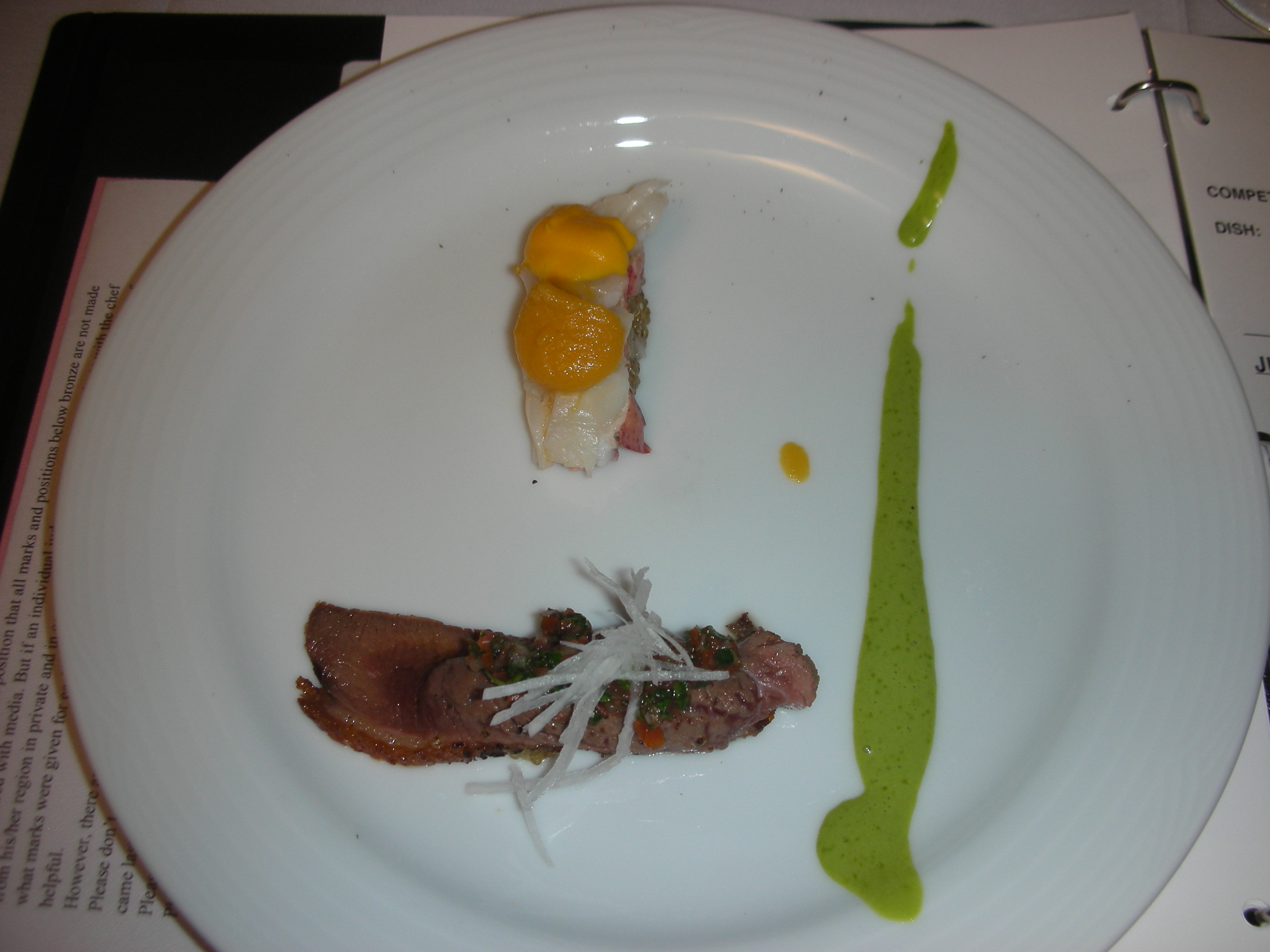 Chef Hill is up next. He offers slices of seared duck breast in a presentation that looks fairly simple at first glance but in fact is a treasure trove of techniques and subtly used Asian flavours. Yam purée is spiked with miso, star anise, soy and sesame. Threads of the turnip are quickly pickled with rice wine vinegar and a blend of spices. A spoonful of lavender-scented sea-buckthorn gastrique is the colour of a desert sunset and brings the duck to life. An intense stock whipped up from the roasted duck bones and a little chicken stock serves as a second sauce. Hazelnut dust spiked with chili powder provides interesting texture and the dish is finished with a couple of watercress leaves and a trace of watercress oil. Balanced, accomplished… an excellent dish.
