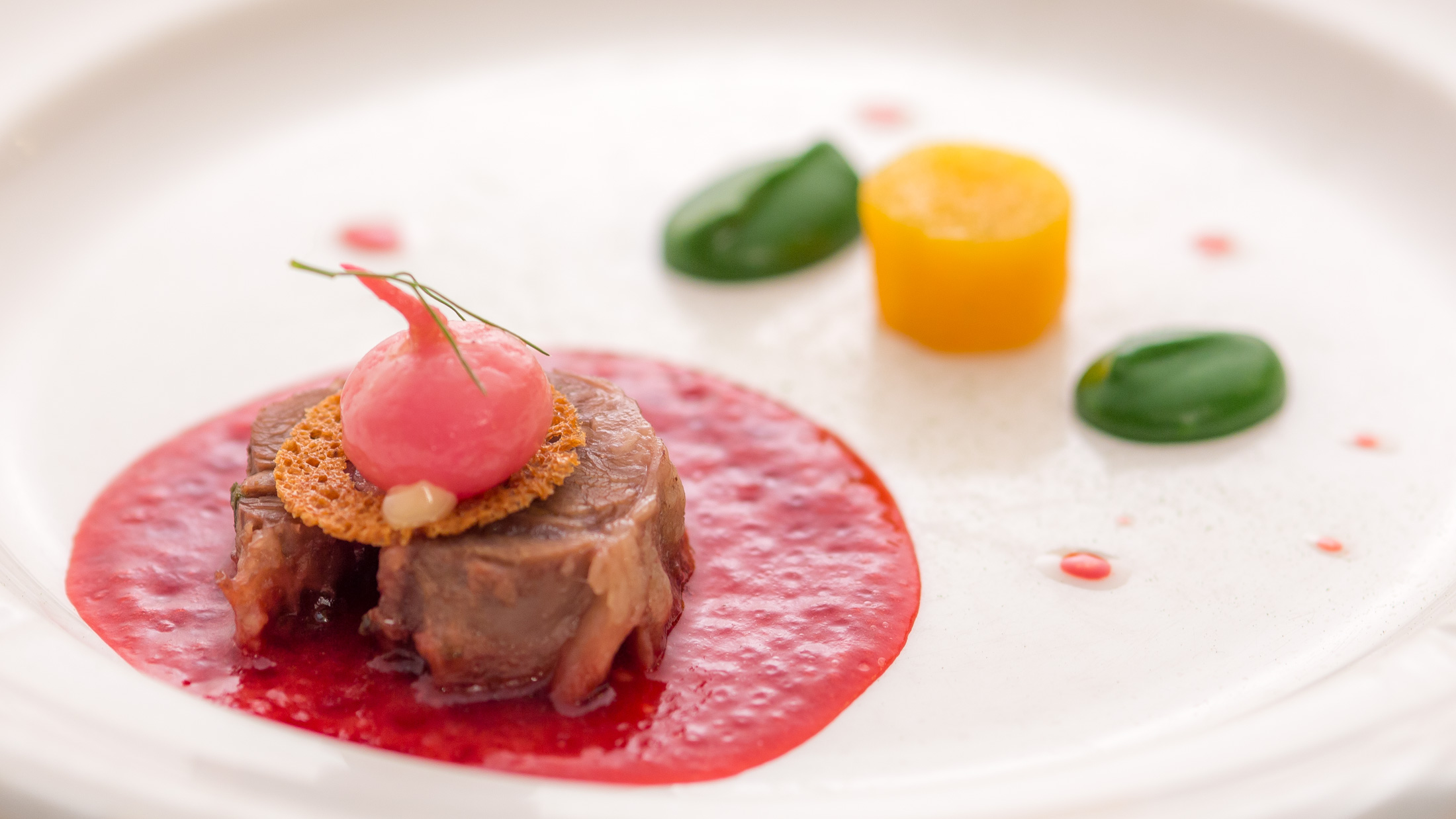 Martín Ruiz Salvador’s creation was the ninth of the evening and it set off in a very original and visually beautiful direction. A roll shaped like a canneloni was wrapped in smoked salmon and contained a generous amount of Dungeness crab meat. This tube lay on a pool of smoked parsnip fumet with the texture of a light purée. On top of it was a teaspoonful of Acadian sturgeon caviar, which chef had acquired at a most advantageous price, showing his bargaining skills. Firm celery root, diced compressed beets and morsels of crisped bread paid court to the salmon roll.