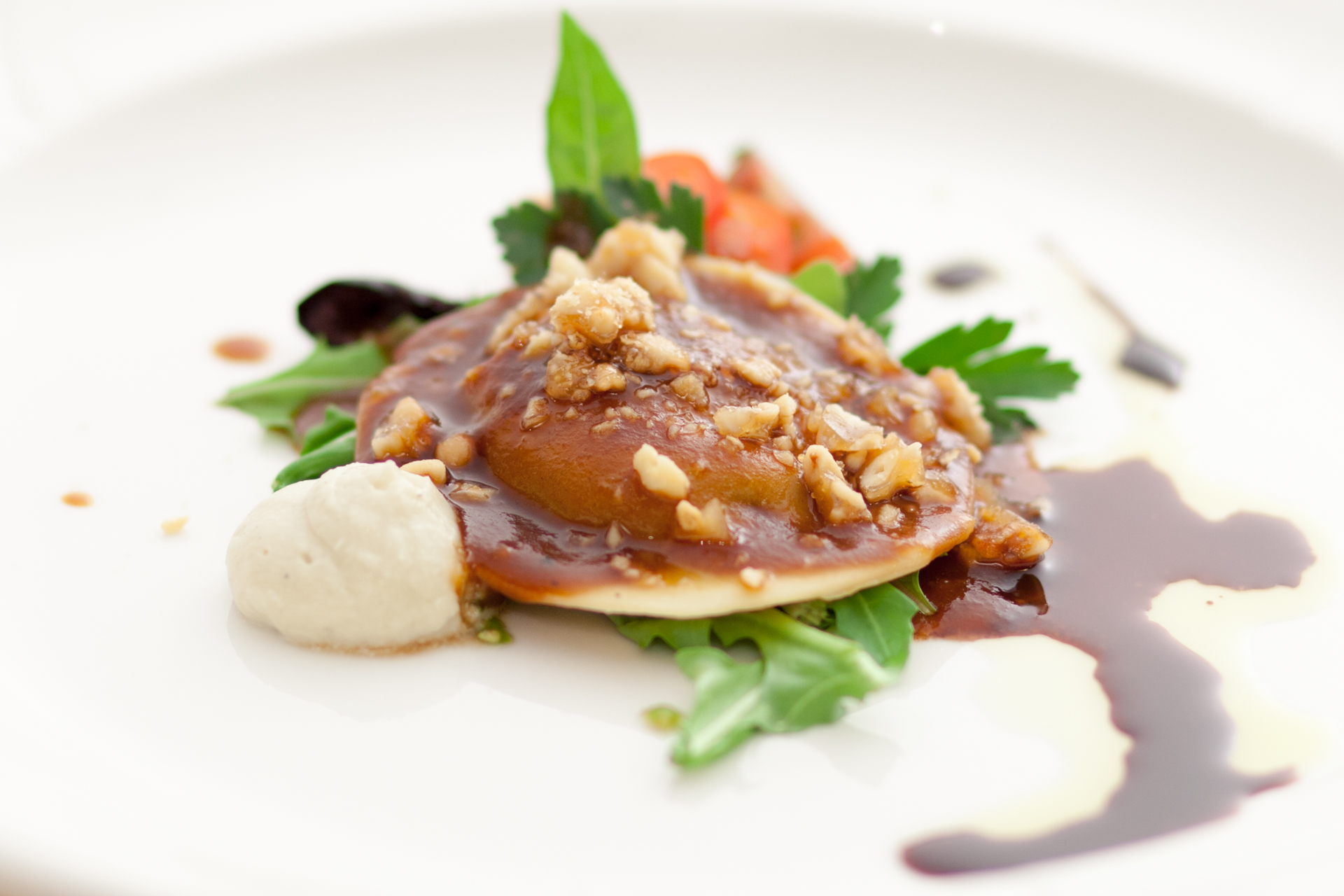 For our final consideration, Norm Pastorin sent out a single ravioli stuffed with venison, the pasta nicely judged in terms of tenderness, the meat deliciously seasoned. The dark sauce that dressed it seemed to echo the flavour of the braise. Dabs of a blue cheese mousse contributed richness and depth; a mound of eggplant caponata added refreshment and a valuable vegetable balance, as did the peppery arugula leaves scattered on top. A sweet crumble of candied pine nuts finished the idea.