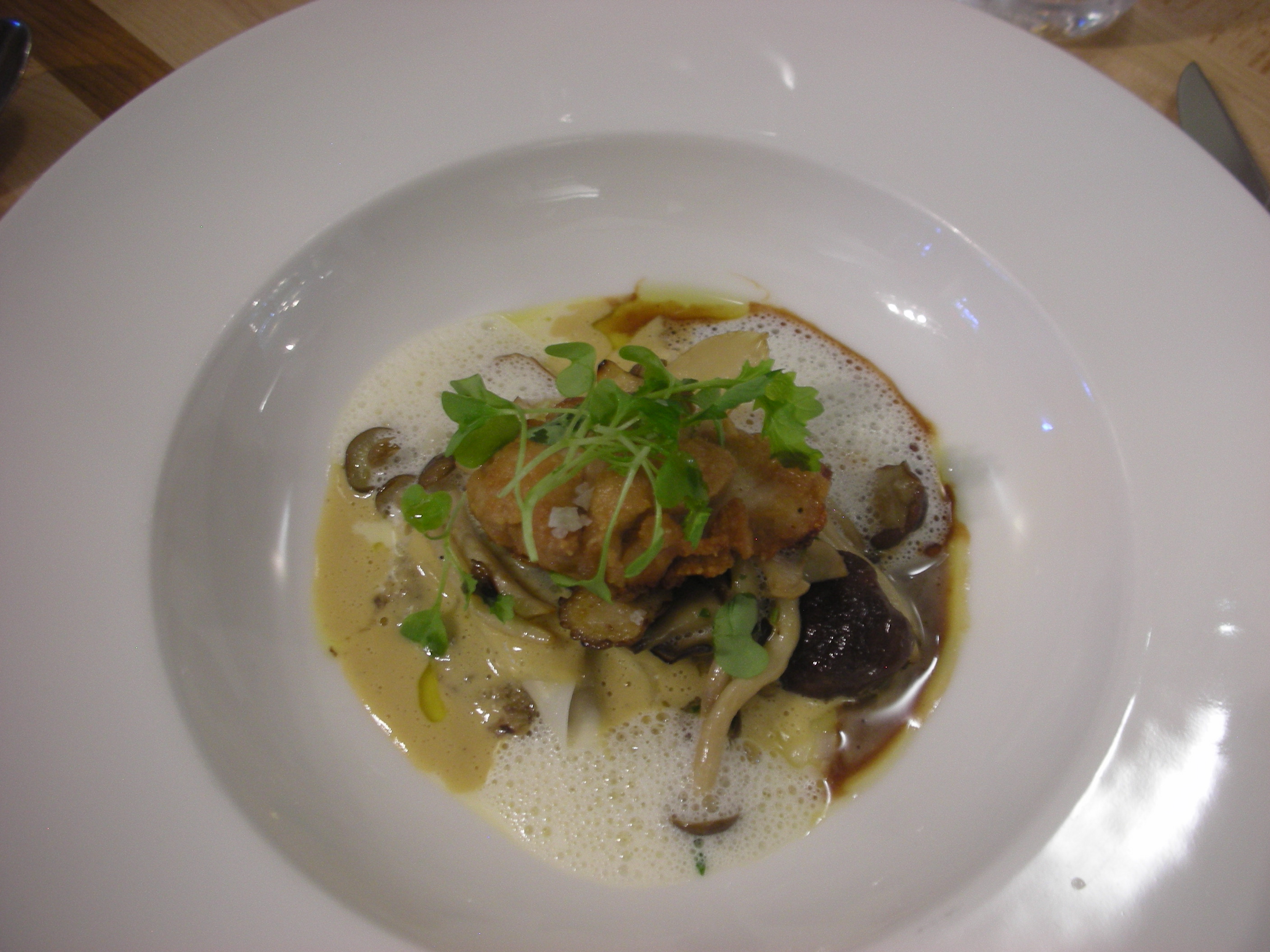 We awarded the bronze medal to chef Stelio Perombelon of M.Mme (pronounced “Monsieur-Madame”). He chose to work with boned guinea-fowl thighs, turning them into a ballotine held together by the bird’s crisp skin and cooked sous-vide at 68o. The meat was juicy, supple but firm and full of flavour. Three little drums of the ballotine were placed on the plate, each crowned with a peeled Pacific sidestripe shrimp. Dabs of a yellow ochre purée turned out to be thickened sweet potato bisque, emulsified with oil from the shrimp. The shrimp shells had been roasted, dehydrated and ground to a powder that chef mixed with a little cayenne and used as a decorative, spicy dust on the plate. Adding a clever acidic contrast was a mound of sliced pattypan squash – the last of the season – treated like bread-and-butter pickles with a quick bath in vinegar seasoned with sugar, salt, coriander seed and celery seed and just a suggestion of the house curry powder. We all agreed that the balance of delicately sweet and subtly tart elements was beautifully achieved. Chef paired his dish with another local wine that was new to me – a blend of Chambaudiere and Seyval grapes, fermented and aged in new oak and called Mirabel, the creation of Vignoble Négondos in Quebec’s lower Laurentians. Its peach and yellow plum notes were particularly in tune with the sweet potato purée.