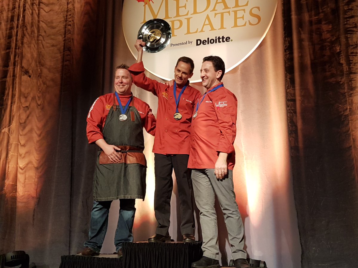 So we already had two former Saskatoon champions on the podium when I announced the winner of the gold. Not the first gold this week for Scott Torgerson of Radisson Hotel Saskatoon and Aroma Resto Bar! He had just returned from the Culinary Olympics in Germany where the Canadian team won gold in both hot and cold cooking. The dish he prepared for us was a beauty in both its looks and its technical finesse. Its protein was a slice of a roulade made with wonderfully tender roasted elk flank and Cactus Lake beef tenderloin, the meats limned in black from a black trumpet mushroom crust. Echoing the mushroom were dots of a porcini-sunchoke foam and three whole Saskatchewan button chanterelles. Petals of a white pearl onion topped a satin-textured parsnip purée and a chicherone-like crisp made from reconstituted beef tendon added crunch. Al of these elements were offset by a dramatic swirl of broccoli purée raked around a quarter of the plate and the finishing touch were two or three fronds of micro-cress. It was a dish that struck us all with its clarity and careful harmonies, and though barely two percentage points separated it from Christopher Hill’s silver, the judges had no hesitation in giving Scott Torgerson the gold. The wine match was another success – a suprsingly delicate Okanagan Zinfandel 2014 from Inniskillin’s Discovery Series that complemented the flavour of the elk very well indeed.