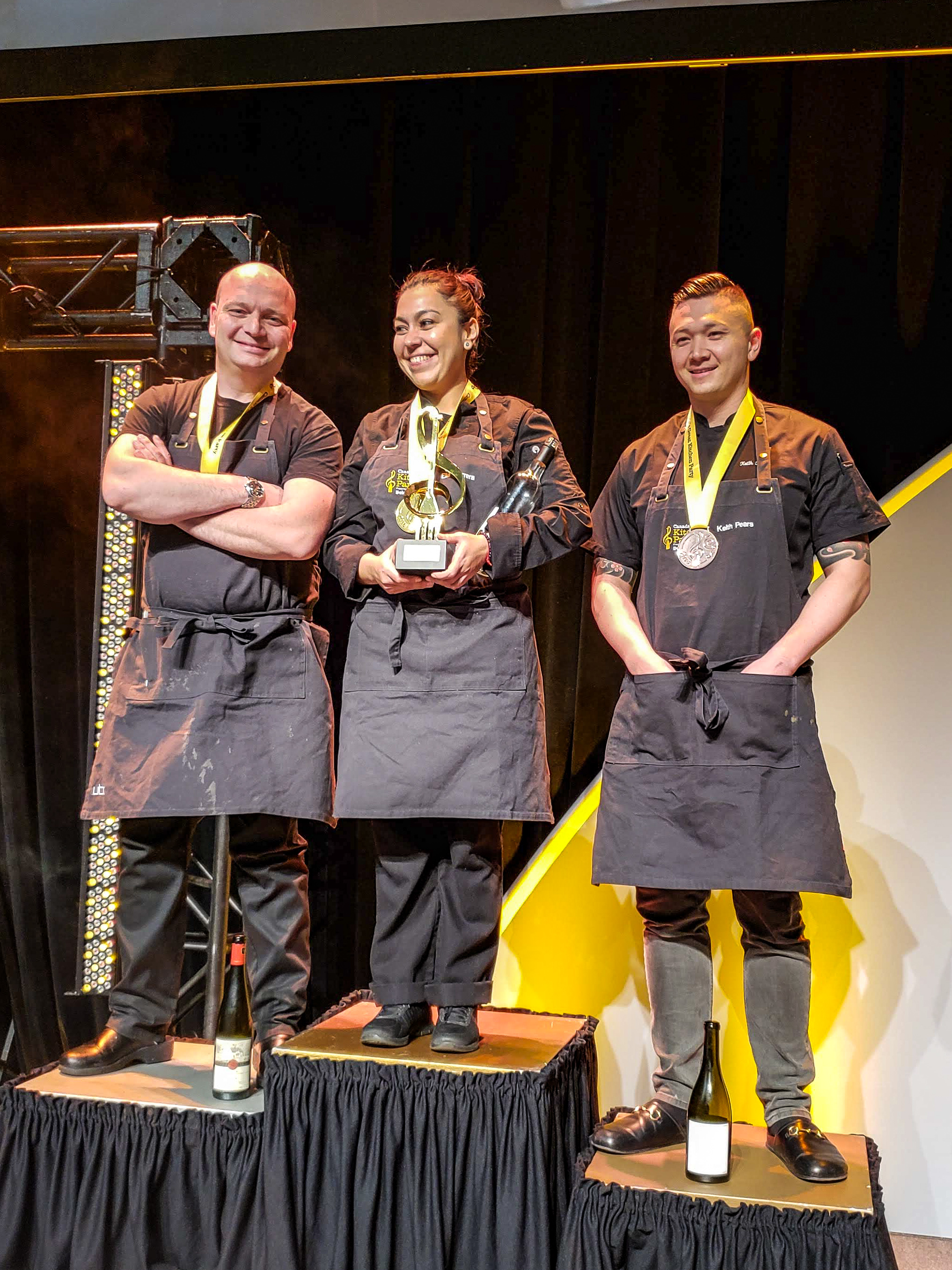 Here’s how it all went down. We awarded the bronze medal to Keith Pears of the Delta Hotel, Toronto. He worked with excellent Rougie duck from Quebec, giving each of us a perfect slice of the breast. Most of the fat layer had been melted out but the tender flesh was still pink and juicy. Propped up beside it stood a tissue-thin crisp of the duck’s skin and close by was a croquette of rich, well-seasoned duck confit and mushroom duxelles crusted with sesame seeds. Combining a little of the croquette with a piece of breast on one’s fork brought both elements into a delicious balance. The fourth duck component was a ball of creamy foie gras parfait, subtly flavoured with peach and vanilla and contained by its own “skin” achieved through some arcane molecular technique. On top of the breast was a small purple tricorn hat that turned out to be a thin slice of beetroot, pinched together to become a container for a rich tartare of beet, apple and cream cheese. Chef piped dots of squash purée onto the plate – he had included squash juice in the recipe which gave the flavour a slightly funky edge. A spoonful of emulsified jus tasted intensely of duck. It was a disciplined, elegant dish, full of precise techniques. Chef’s wine match was a bold one, choosing white rather than red, but it worked well – the oaky 2016 Barrel-fermented Chardonnay from Trius winery in Niagara.