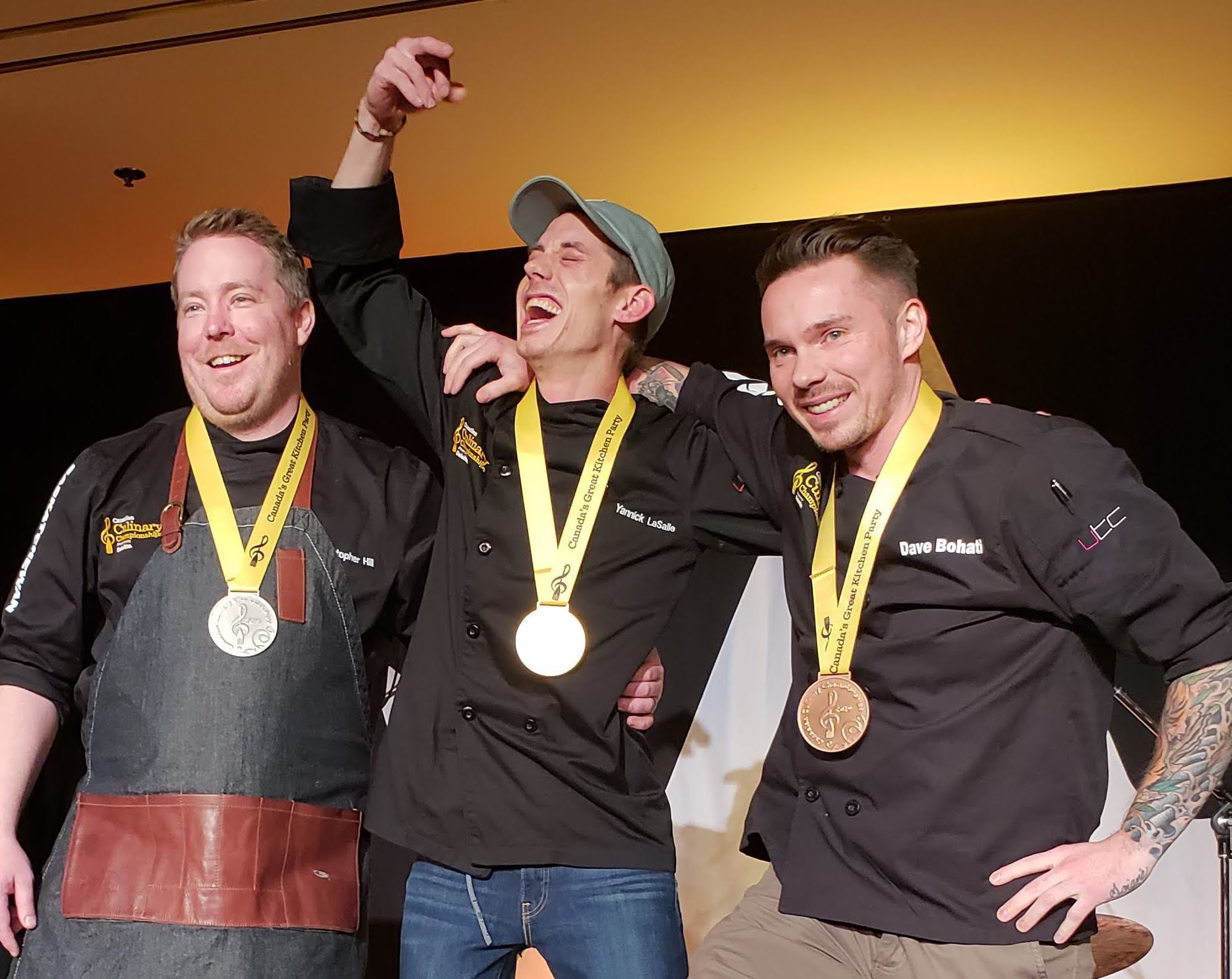 While the party went into overdrive in the ballroom, we judges totted up our scores and fed them into the master program on my computer. We have never had a Championship where the marks were so closely grouped with all eleven of the competitors still in a pack at the finish line. Chef Ito had won the Grand Finale with his masterful dish of west coast seafood but it was not enough to push him onto the podium. When all was said and done, Chef Dave Bohati won the bronze medal, Chef Christopher Hill the silver, and the new Canadian Culinary Champion was Chef Yannick LaSalle of Les Fougères in Chelsea, Quebec, representing Ottawa-Gatineau – a hugely popular and well-deserved victor who had made hundreds of friends over the weekend.