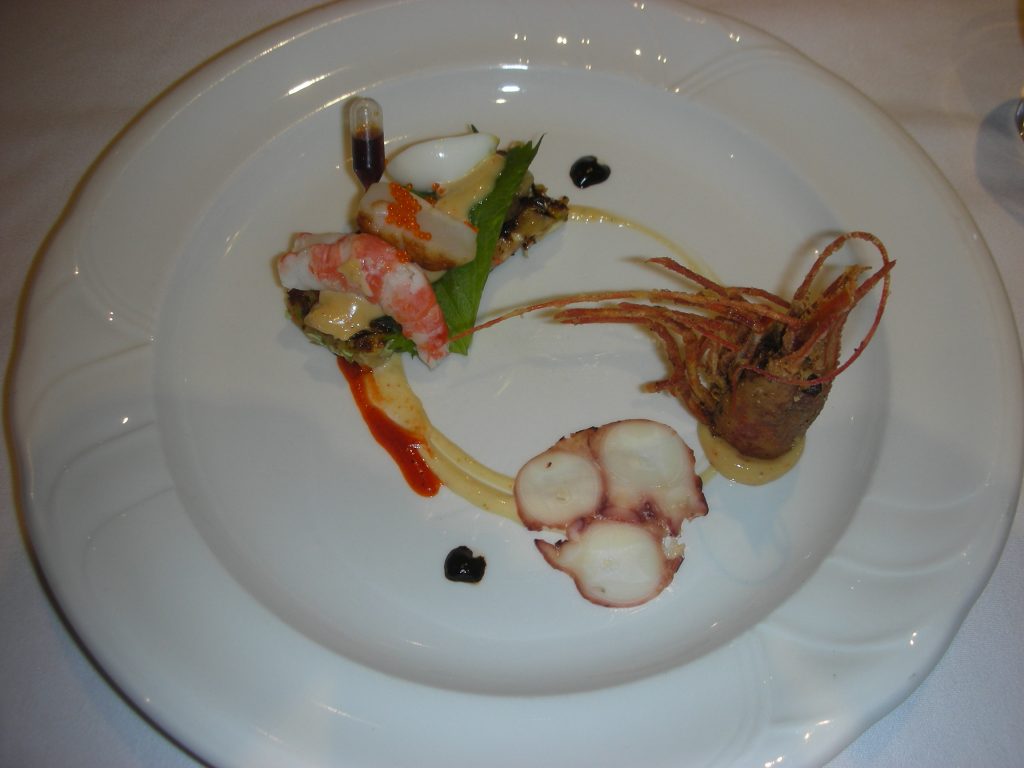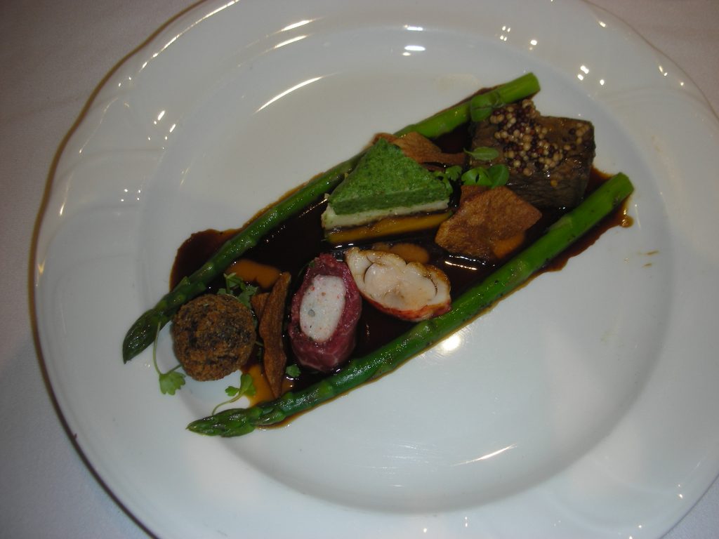 The first chef to bring his dish to us was Chef Jason Morris of Pastel in Montreal. Seven separate elements adorned his plate most elegantly, four of them cauliflower – tiny, perfectly textured florets of purple, green and yellow varieties, and a dab of silky, buttery white cauliflower purée. But duck was the dish’s principal ingredient. Chef created a ballotine by setting strips of duck breast in a matrix of puréed chanterelles, truffles and duck jus, cooking it sous vide then finishing it on the grill. A round slice cut from the cylinder had the appearance of a mosaic and Chef Morris sauced it at the table, pouring on a jus made from the duck bones enriched with a little foie gras. More foie gras was turned into a creamy torchon – a dainty cylinder half an inch long and no thicker than my pinkie – wrapped in a red skin of cranberry gelee. A golden sphere the size of a golf ball turned out to be a cromesquis of juicy confited duck leg seasoned with burned thyme, sage and burned onion, mouthwateringly tender beneath a crunchy crust of fried potato flakes. The duck mosaic had a pleasingly firm texture – nothing pasty at all – and the flavours were all lucid and true. The chosen beverage was the bold, fruity, unfiltered Izumi genshu junmai sake produced in Toronto’s Distillery District, its creamy weight nicely judged against the textures of the dish, its floral nose working particularly well with the multicoloured cauliflower jewels.