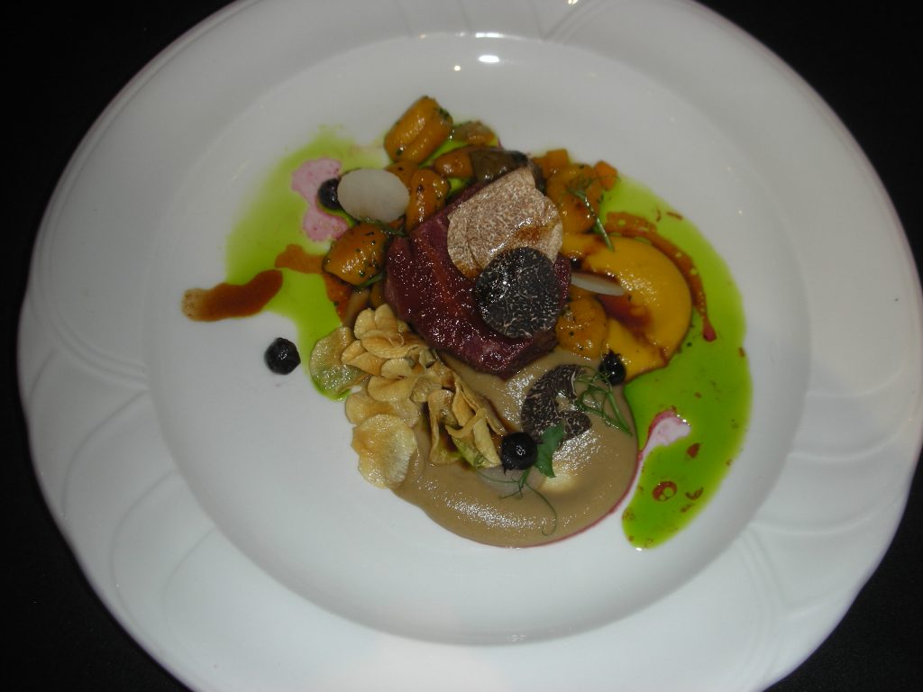 Dish number eight was the masterful work of Chef Dave Bohati of Murrieta’s in Calgary. He chose to work with Brant Lake wagyu beef cheek, first brining it like pastrami for 72 hours then smoking it, crusting it, slow-cooking it sous vide and finally braising it. The result was astonishingly tender meat that fell apart at the touch of a fork, subtly flavoured with sweet smoke and thyme, star anise and black pepper. Chef paired it with four different preparations of Jerusalem artichoke – a rich purée, small roasted nuggets of the root, crunchy crisps and dime-sized slices of raw sunchoke that he briefly acidulated and vacuum-packed to keep them fresh and firm. Kabocha squash was the other major ingredient, used as a second purée, as a tender brunoise and also to make lovely little gnocchi, finished in a sauté pan with some roasted bone marrow and shaved fresh Burgundy truffles. Saskatoon berries served as a condiment, macerated in Chef’s chosen Pinot Noir but still whole and juicy. A little green herb oil was the finishing touch, bringing colour to the plate. That Pinot Noir, the 2016 Tantalus from Kelowna, BC, was an inspired choice made, Chef Bohati explained, because of the wine’s peppery notes and unusually high alcohol.
