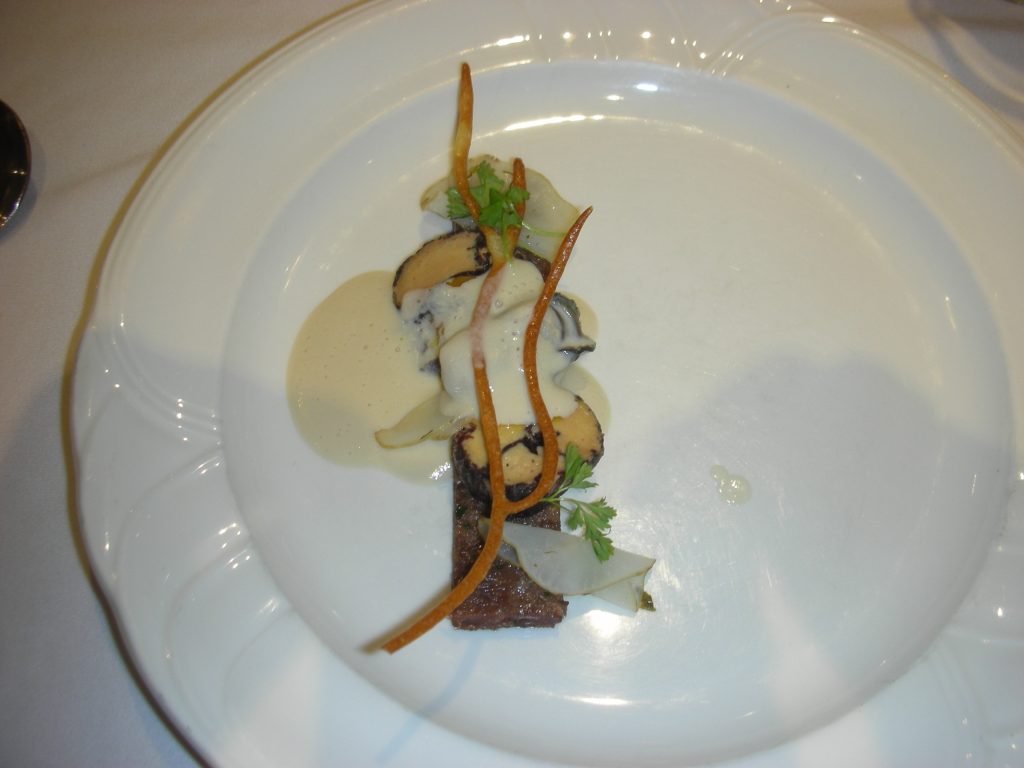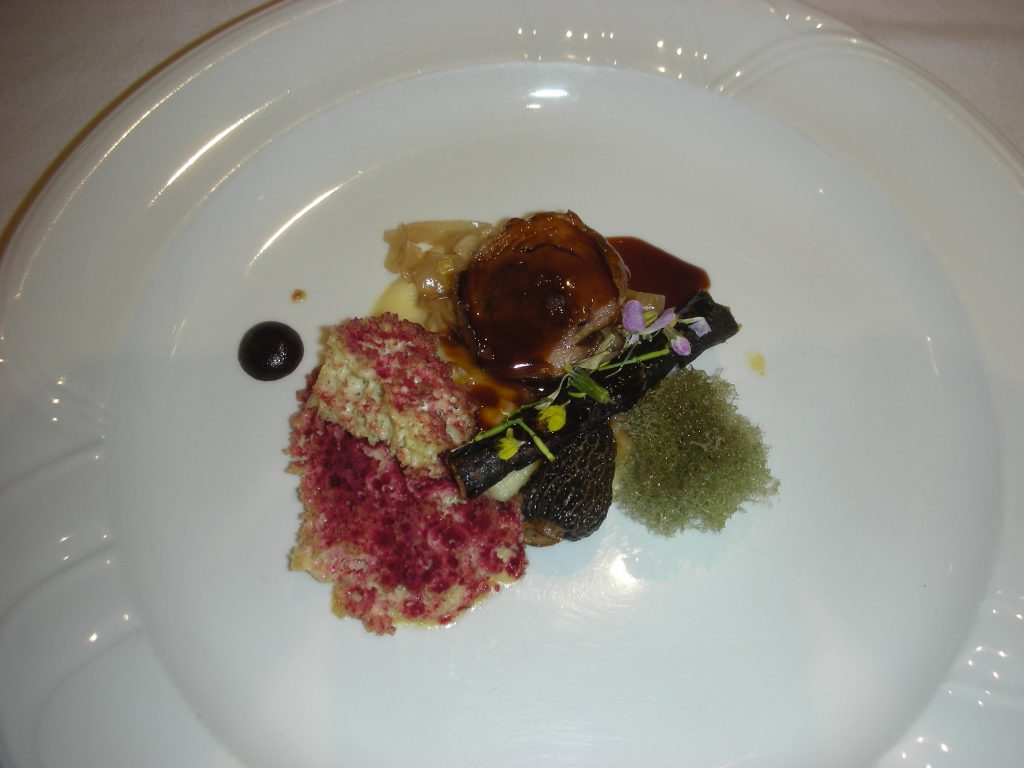 Chef Christopher Hill of Taste Restaurant Group in Saskatoon won his regional gold medal with a dish he called “After The Fire” and he recreated it for us tonight. The inspiration was the way in which nature recreates itself after a fire and Chef introduced the idea by bringing a tray of smouldering cherrywood under a belljar to give us an olfactory hint. At the heart of the dish was a roulade of lightly cured, lightly smoked duck leg, confited and rolled with wild boar sausage, the meat blessed with a wonderfully juicy toothsome texture. Beside it Chef piped an aerated foie gras mousse with an ethereal texture, its surface tinted red with beet powder. Here was a parsnip purée, subtly flavoured with rosemary, there a whole morel sautéed in butter, and there a small mound of tender-crunchy smoked cabbage. A hank of crispy reindeer moss spoke of the woods while dots of intense sour cherry syrup recalled the orchard. A strip of chewy “bark” was made of salsify cooked in birch syrup, adding an intriguingly dark and bitter note to the spectrum of flavours. Juniper jus and flower petals finished the dish. A whisp of smoke from the belljar hung in the air – as it once did over the vineyard that produced the wine Chef chose, the 2017 Pinot Noir from Meyer Family Vineyards in the Okanagan Valley, a mouthful of spicy cherries. In that year, wild fires raged over the surrounding hills, though the grapes survived untouched.