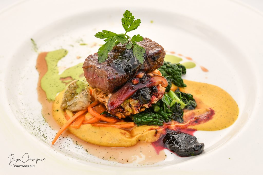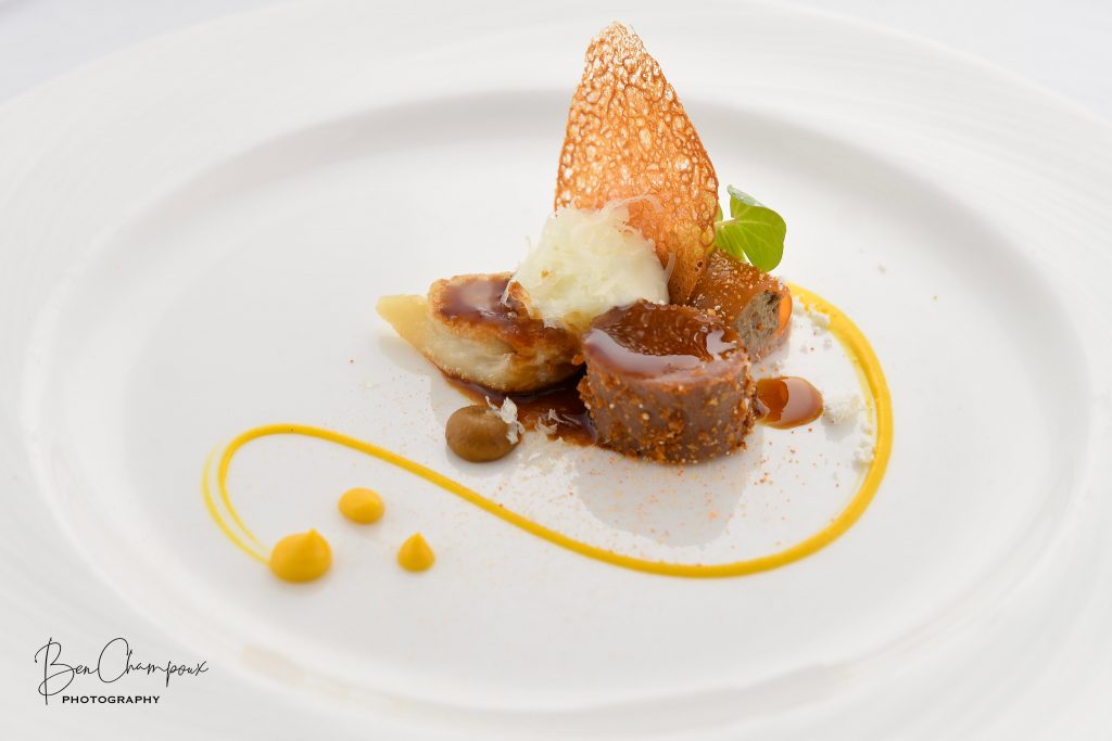 Chef Ian Carswell, the local champion, from black tartan kitchen, in Carleton Place, Ontario, was our penultimate competitor, bringing a dish he called “lamb with neeps and tatties.” The lamb came from Milkhouse Farm, not far from his restaurant, and Chef was careful to waste nothing of the animal. He gave us a wee coin of the loin cooked sous-vide to tender perfection, crusted with buckwheat and dressed with an unctuous glacé stock. The lamb trimmings and offal were mixed with mushrooms and the sort of spices normally used in haggis, then whipped into a silky-smooth cream with just enough solidity to retain its shape when formed into a cylinder. This was coated with a skin of jelly made from rutabaga (aka neep, aka swede) and carrot juice. It was a pinky-sized morsel set on top of a firm postage stamp of a peppery terrine made from the lamb’s hind quarters. Yet another element was a miniature perogie, crisp and buttery from the pan, and stuffed with Tomme sheep’s milk cheese (also from Milkhouse Farm) and braised meat from the lamb’s shoulder, neck and foreshank. A snow-white spoonful of aerated Tomme chantilly crowned the trio while the plate was decorated with a swooping ‘S’-and-three-dots of a yellow purée made from rutabaga and carrot and a flurry of caramelized onion “snow.” Buckwheat sprouts and a dainty fin of a tuile made from lamb belly stock completed the homage to the animal. Chef chose his wine from a local winery in Carp, Ontario – the fruity KIN 2018 Pinot Noir – a well-made match.