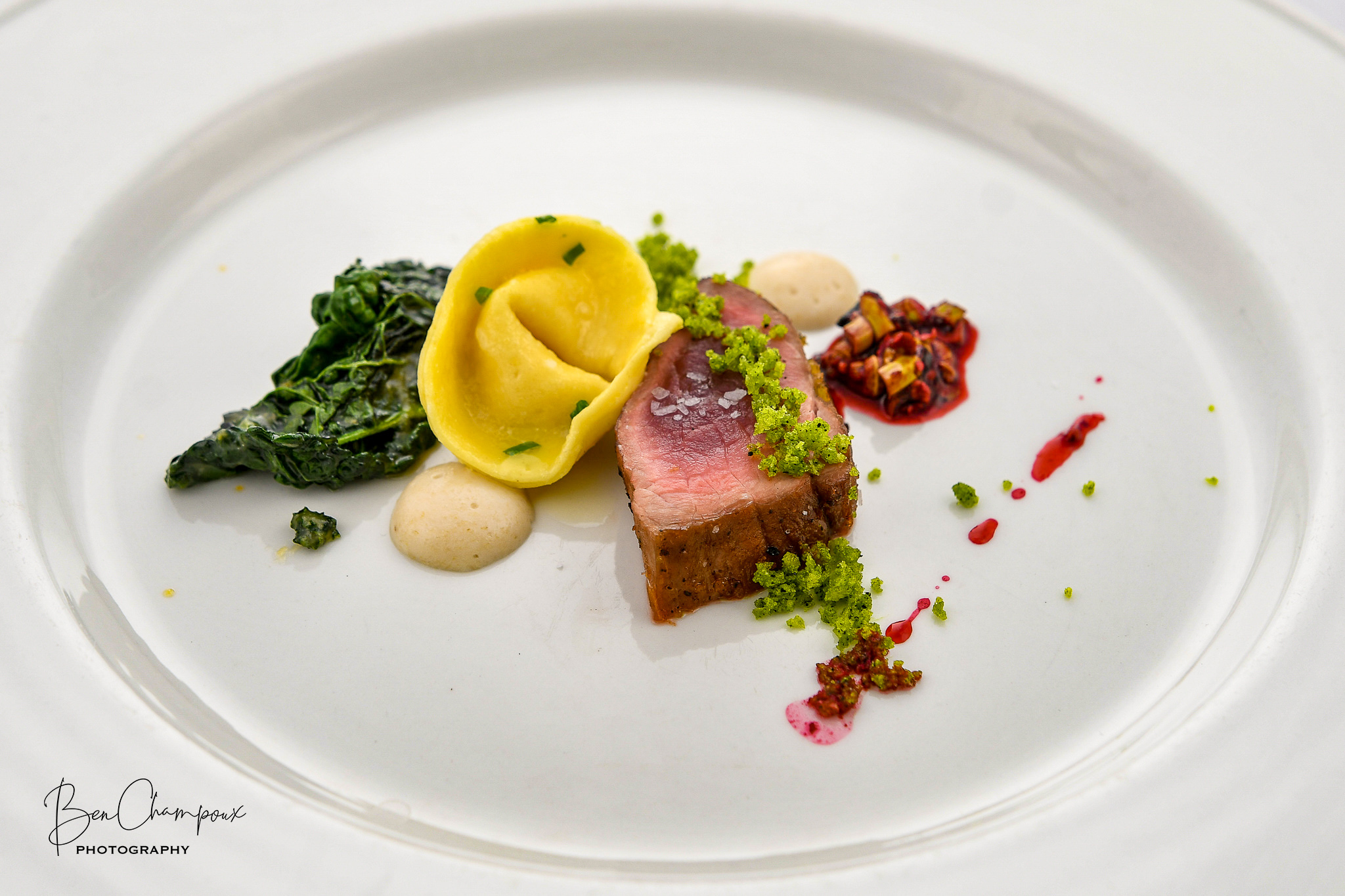 Our eighth dish was created by Chef JP Dublado (Edmonton). He pan-seared the elk and cut it into thick steaks, flanking it with miso-braised kale that also made good use of the plankton powder and shallots from the pantry. Chef combined the fiddleheads and haskap berries into a zesty salsa (a spoonful lay beside the meat) and used the plankton again, stirred with panko crumbs and butter, to mke a festive-looking green crumble. The parsley root became a purée with which Chef filled swiftly-made tortellini. He made a purée from the oatmeal and piped two little mounds of it either side of the elk.