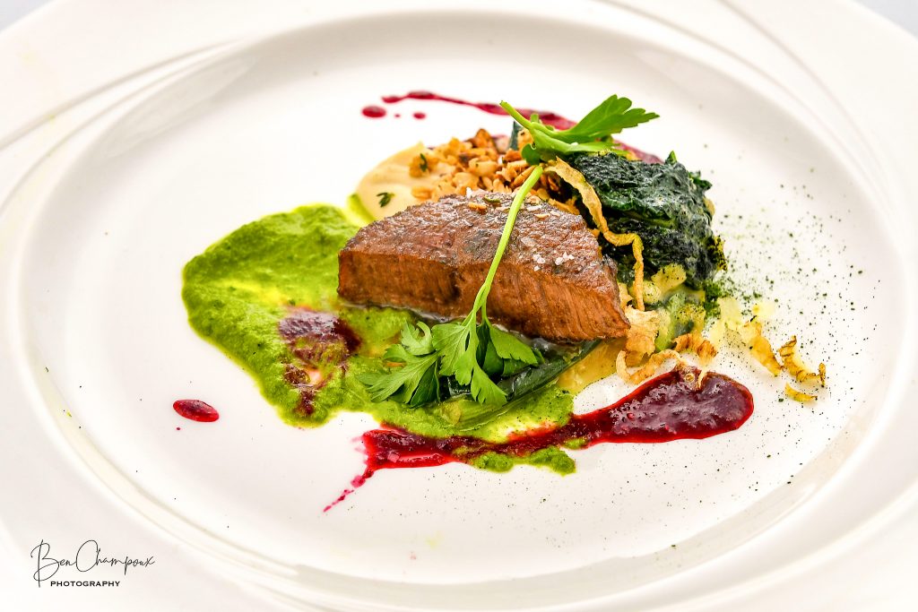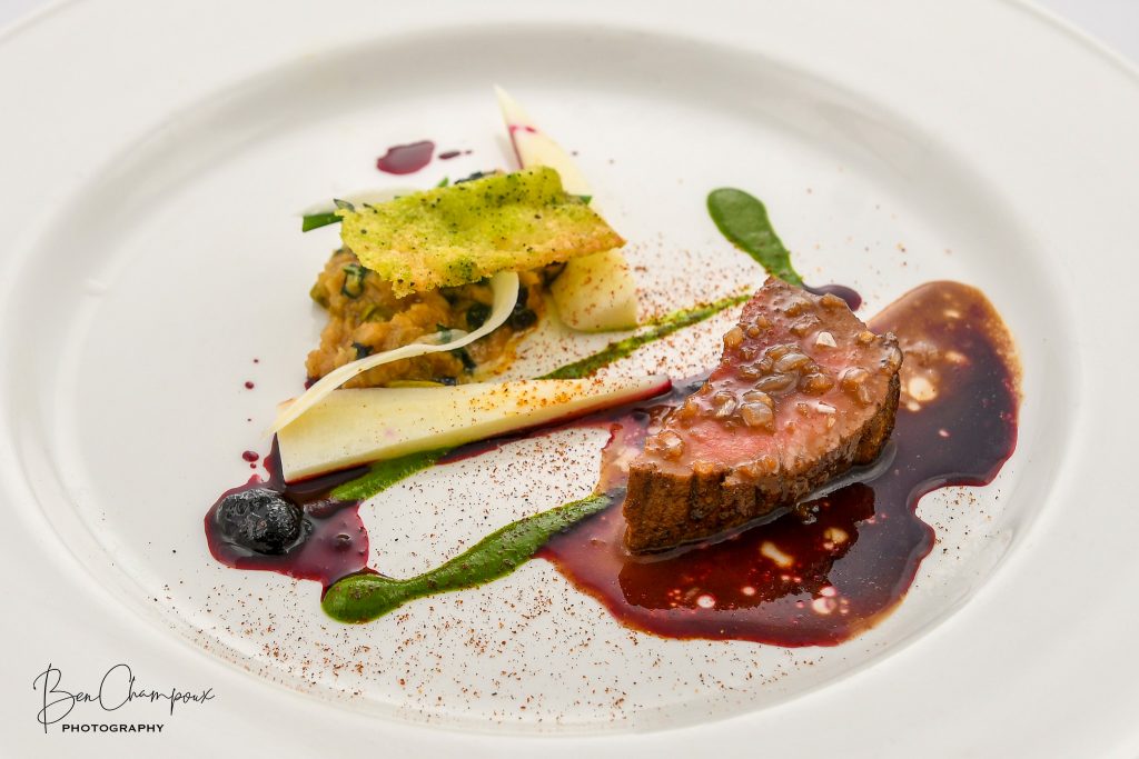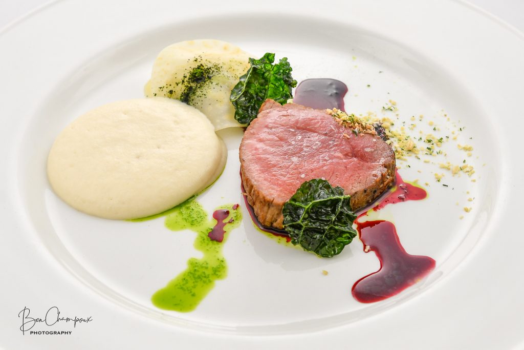 Up fourth was Chef Kai Koroll (Kelowna). He pan-seared the elk and cut it into thick, flavourful steaks that had the perfectly acceptable tenderness of a flank steak (a fine testament to the quality of the meat from Elk Ranch!). He cooked down the chopped fiddleheads, a little of the plankton and a great deal of leek and used it to fill a single raviolo made not with pasta but with a paper-thin sheet of celeriac; more plankton dusted its surface. The parsley root became a foam, enriched with parmesan, while the oatmeal appeared as herbed crumbs spooned over the edge of the elk steak. Haskap gastrique and a green oil made with the parsley tops were finishing touches.