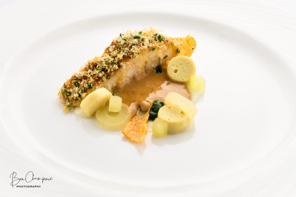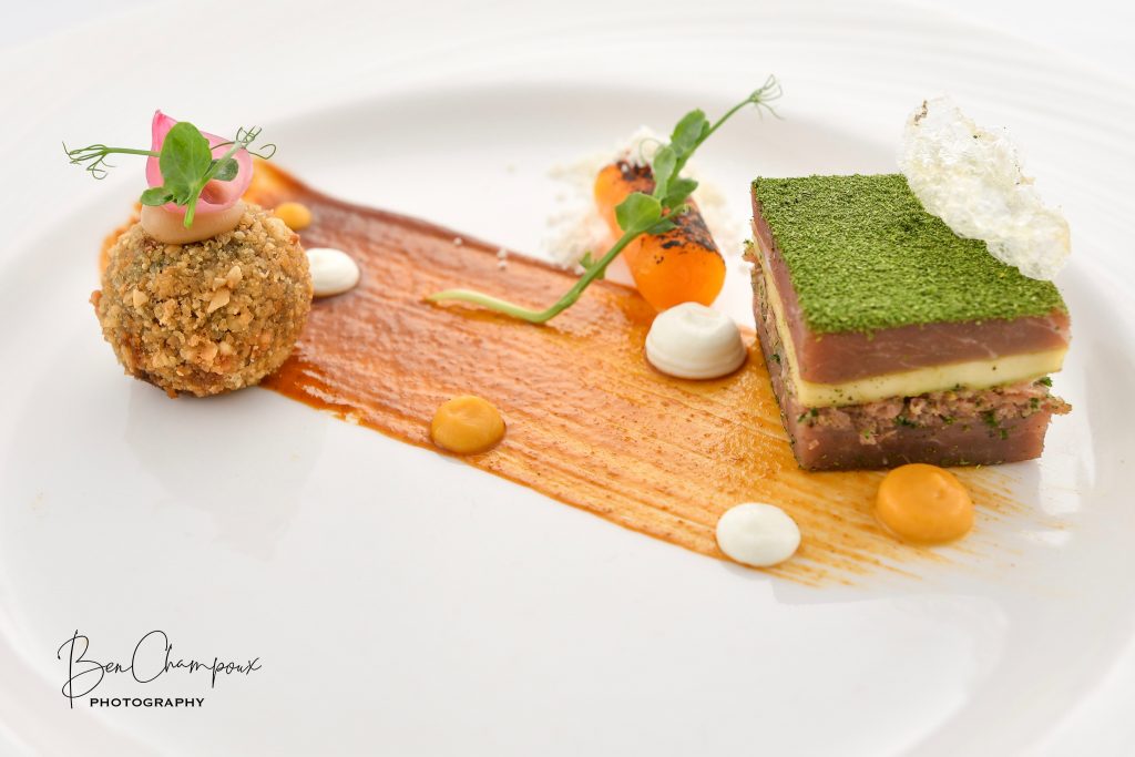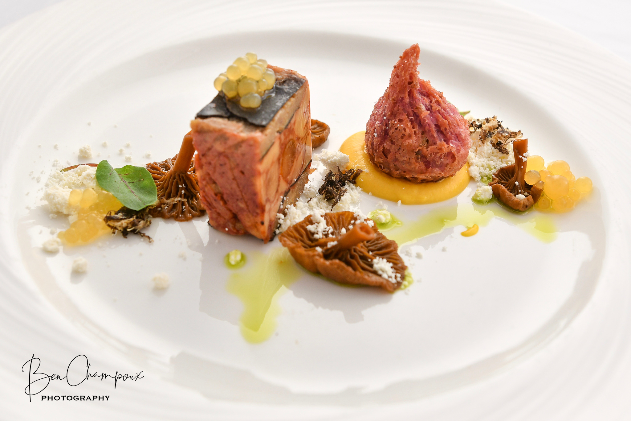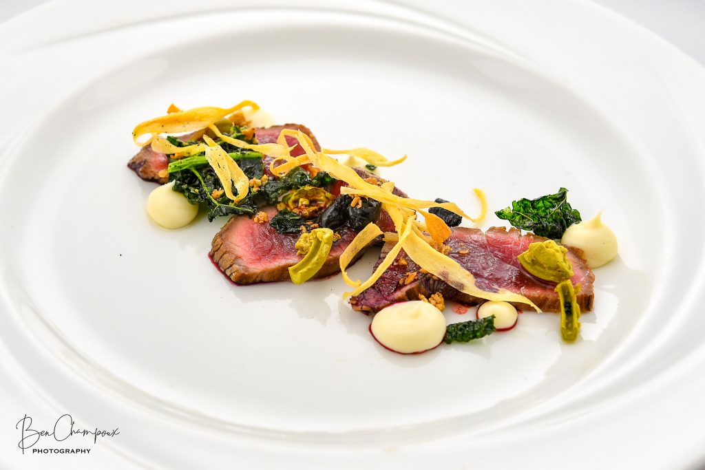 Chef Roger Ma of Boulevard Kitchen and Oyster Bar, in Vancouver, was third up, offering a meticulously detailed, almost intellectual exploration of B.C.’s coastal terroir. There were many small but perfect elements on the plate. Leading the way was a single honey mussel, farmed on Lasqueti Island. Chef steamed it then gratinéed it with a miso butter crust and a hint of preserved sansho pepper. A caramel-coloured disc of custard turned out to be made from sea urchin cooked with dashi and set with carrageenan; dots of meyer lemon purée and three salmon eggs, like tiny rubies, flattered the custard most charmingly. “This is my version of “surf and turf” said Chef, indicating a slice of potato and scallion terrine set in a gelee of clam and mussel nectar. Its heart was a quarter-sized cirle of Yukon Gold that had been poached in an umami-rich shellfish stock then wrapped with bull kelp. More of the wild, hand-harvested kelp garnished the dish, some lightly pickled, other fronds marinated in soy then fried to a crisp, The finishing touch was a lightweight, milky nage made from clam juice and dashi. It was a fascinating symphony of flavours, every mouthful bringing a uniquely different experience. Chef’s wine match was exceptionally well chosen – the bright, sturdy 2018 Unicus Grüner Veltliner from Culmina Family Estate Winery.