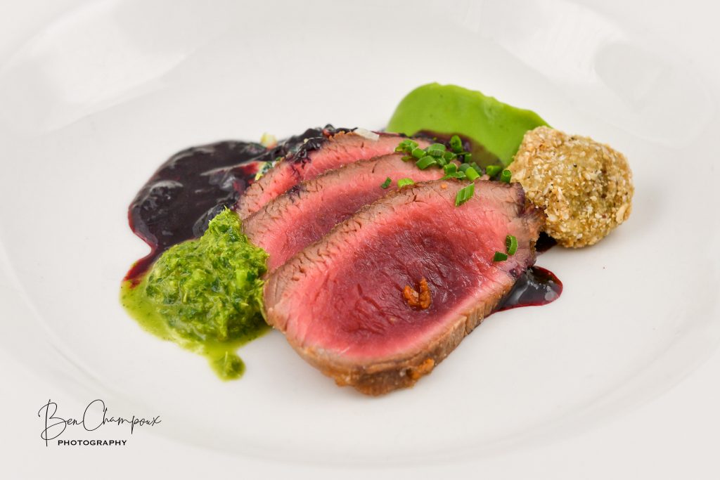 Chef number six was Emily Butcher (Winnipeg) who decided she had time to prepare the elk in two very different ways. On the left of the plate she presented a hand-chopped tartare sharpened with mustard and topped with a pickled fiddlehead and a brunoise of pickled beets and onion confit, all set on a crispy kale chip. On the right were small slices of the rare-seared elk crusted in miso and plankton powder, its marine flavour deliciously pronounced. The meat lay on a pillow of creamy parsley root purée, surrounded by two or three tiny clumps of sweet-and-savoury toasted oatmeal granola. Chef turned the haskaps into a jus using stock from the pantry – as meaty as it was fruity – and spooned it over the seared elk. Crispy ribbons of fried parsley root topped that side of things. It was basically two dishes in one – ambitious, given the time restraints – but triumphantly achieved.