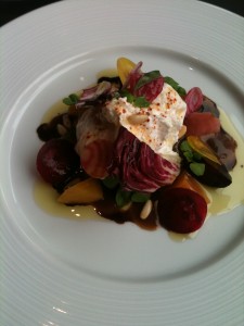 Burrata is the fromage du jour in Toronto these days and some impressive versions are being made in Ontario. But Bangerter gets his flown in from Italy through Cheese Boutique, barely a day or two old and still oozing rich buffalo cream when one slips a knife into its glistening, tender, snow-white heart. The cheese is set on top of a thin but richly flavoured slice of grilled eggplant and surrounded by a kaleidoscope of colourful beets, some cut into soft chunks, others firmer but thinly sliced. A marjoram and pine nut vinaigrette echoes the earthy sweetness of the beets and it’s impossible not to mop the plate with chunks of the lovely crusty breads baked by David Wilson, that masterful artisan of the ovens and the man responsible for Marc Thuet’s loaves, back in the day.