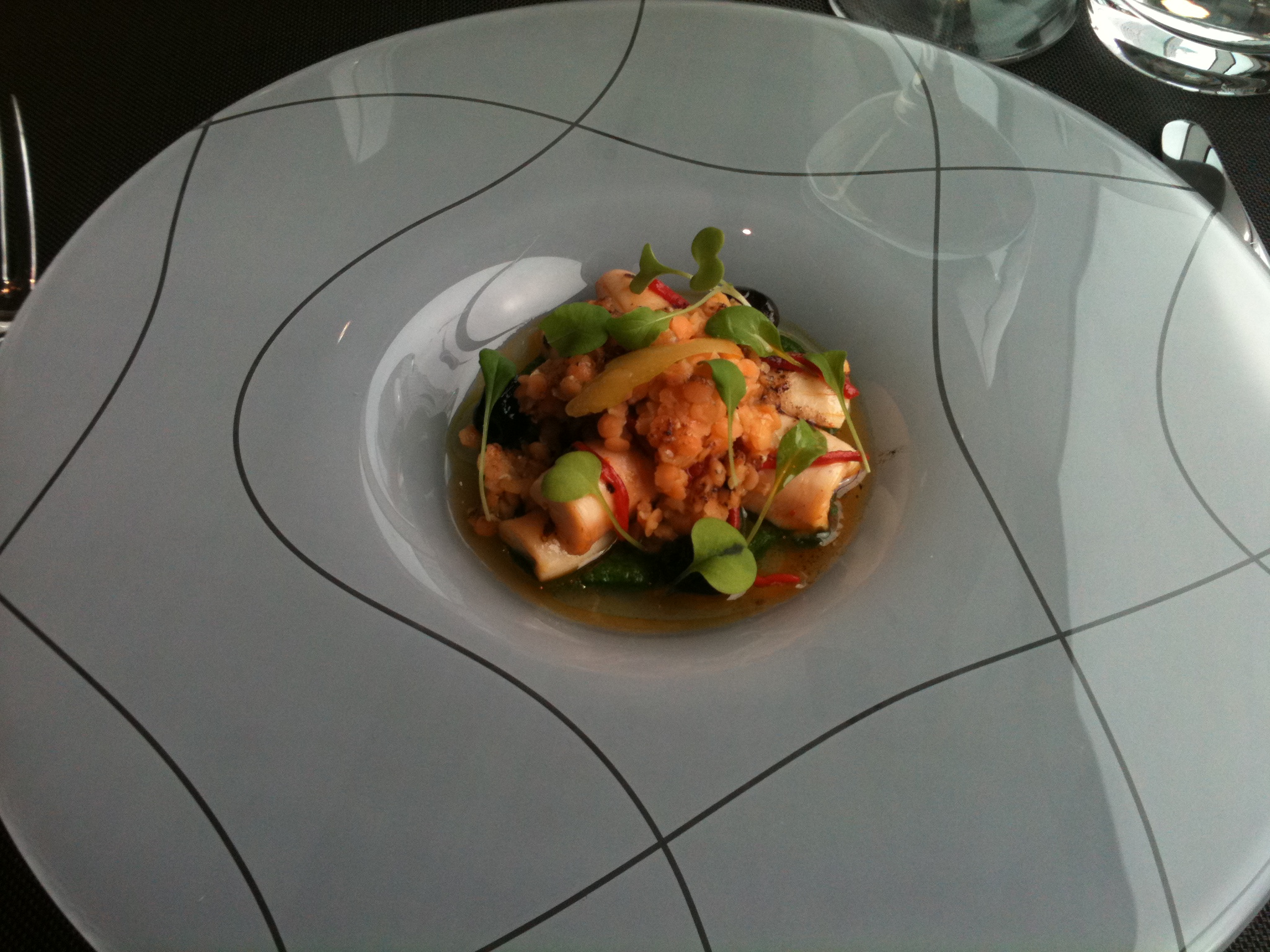 Pale seafood is something of a speciality here but luckily it’s exactly what I feel like at lunchtime. Pan-seared scallops are meticulously timed, surrounded by tiny grilled artichokes and perched on top of a disc of smashed potato. Curls of cured ham are the crown, lemon vinaigrette the dressing. Another dish poses tender grilled octopus with soft, delicately earthy orange lentils, tucked in as if they were some kind of roe. Cleverly orchestrated, secondary flavours don’t mask the octopus’s own taste – preserved lemon, baby arugula, honeyed olives, piquillo peppers – while a tangy arugula pesto brings everything to attention.